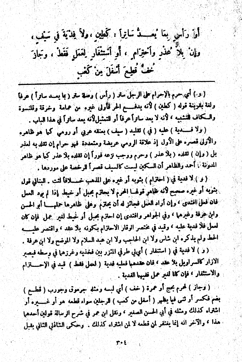 (وَلَا فِدْيَةَ) عَلَيْهِ (فِي) تَقْلِيدِ (سَيْفٍ) بِعُنُقِهِ عَرَبِيٍّ أَوْ رُومِيٍّ كَمَا هُوَ ظَاهِرُهُ وَالْأَوْلَى قَصْرُهُ عَلَى الْأَوَّلِ إذْ عَلَّاقَةُ الرُّومِيِّ عَرِيضَةٌ وَمُتَعَدِّدَةٌ فَهُوَ حَرَامٌ إنْ تَقَلَّدَ بِهِ لِعُذْرٍ بَلْ (وَإِنْ) تَقَلَّدَهُ (بِلَا عُذْرٍ) وَحَرُمَ وَوَجَبَ نَزْعُهُ فَوْرًا إنْ تَقَلَّدَهُ بِلَا عُذْرٍ كَمَا هُوَ ظَاهِرُ الْمُدَوَّنَةِ. أَحْمَدُ وَالظَّاهِرُ أَنَّ السِّكِّينَ لَيْسَتْ كَالسَّيْفِ قَصْرًا لِلرُّخْصَةِ عَلَى مَوْرِدِهَا.