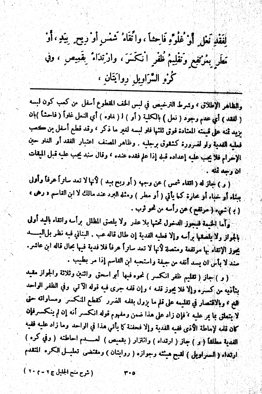 لِفَقْدِ نَعْلٍ أَوْ غُلُوِّهِ فَاحِشًا، وَاتِّقَاءُ شَمْسٍ أَوْ رِيحٍ بِيَدٍ، أَوْ مَطَرٍ بِمُرْتَفِعٍ وَتَقْلِيمُ ظُفْرٍ انْكَسَرَ، وَارْتِدَاءٌ بِقَمِيصٍ، وَفِي كُرْهِ السَّرَاوِيلِ رِوَايَتَانِ
