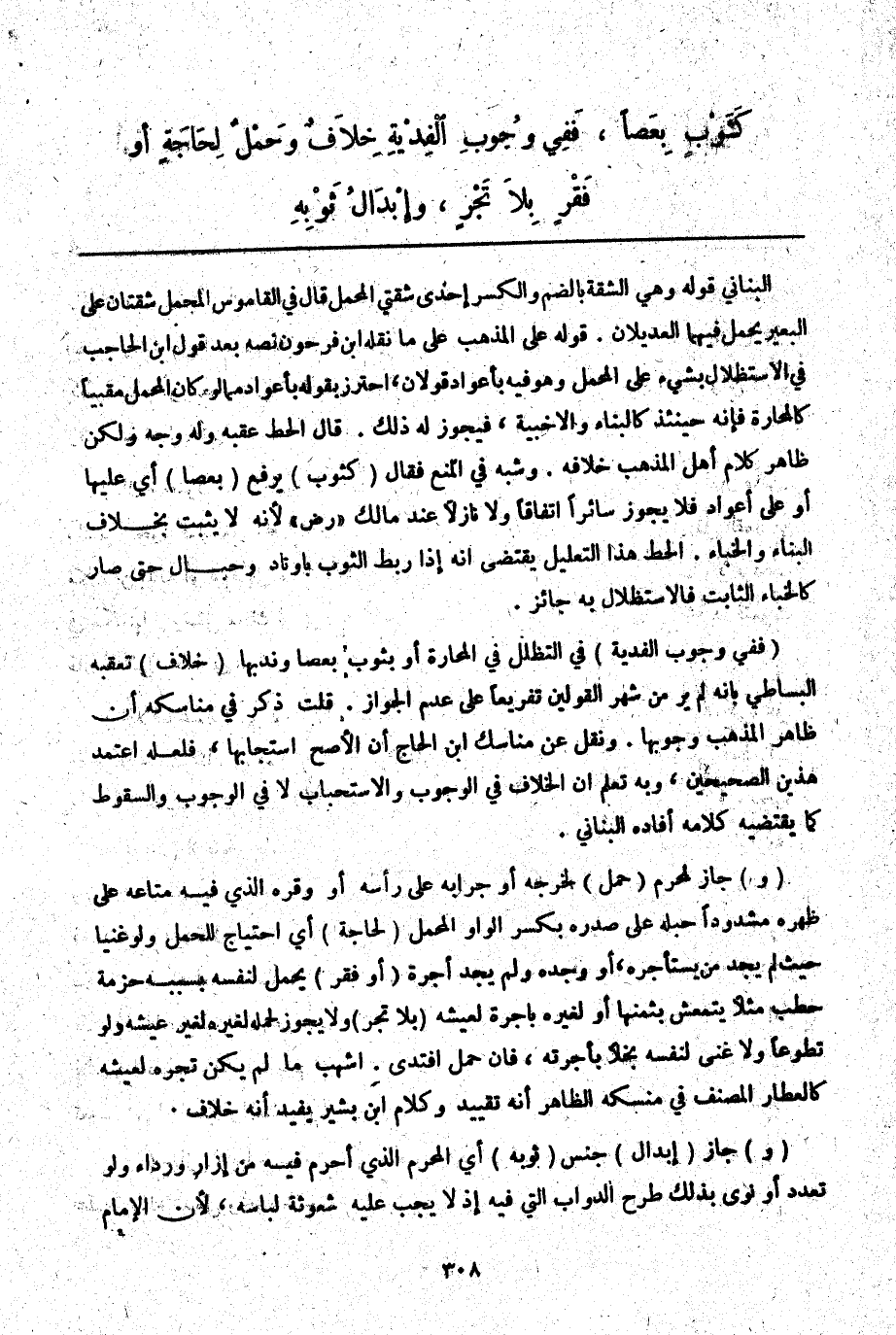 (وَ) جَازَ لِمُحْرِمٍ (حَمْلٌ) لِخُرْجِهِ أَوْ جِرَابِهِ عَلَى رَأْسِهِ أَوْ وِقْرِهِ الَّذِي فِيهِ مَتَاعُهُ عَلَى ظَهْرِهِ مَشْدُودًا حَبْلُهُ عَلَى صَدْرِهِ بِكَسْرِ الْوَاوِ الْمَحْمَلُ (لِحَاجَةٍ) أَيْ احْتِيَاجٍ لِلْحَمْلِ وَلَوْ غَنِيًّا حَيْثُ لَمْ يَجِدْ مَنْ يَسْتَأْجِرُهُ، أَوْ وَجَدَهُ وَلَمْ يَجِدْ أُجْرَةً (أَوْ فَقْرٍ) يَحْمِلُ لِنَفْسِهِ بِسَبَبِهِ حُزْمَةَ حَطَبٍ مَثَلًا يَتَمَعَّشُ بِثَمَنِهَا أَوْ لِغَيْرِهِ بِأُجْرَةٍ لِعَيْشِهِ (بِلَا تَجْرٍ) وَلَا يَجُوزُ لِحَمْلِهِ لِغَيْرِهِ لِغَيْرِ عَيْشِهِ وَلَوْ تَطَوُّعًا وَلَا غَنِيٌّ لِنَفْسِهِ بُخْلًا بِأُجْرَتِهِ، فَإِنْ حَمَلَ افْتَدَى. أَشْهَبُ مَا لَمْ يَكُنْ تَجْرُهُ لِعَيْشِهِ كَالْعَطَّارِ الْمُصَنِّفِ فِي مَنْسَكِهِ الظَّاهِرُ أَنَّهُ تَقْيِيدٌ وَكَلَامُ ابْنِ بَشِيرٍ يُفِيدُ أَنَّهُ خِلَافٌ.