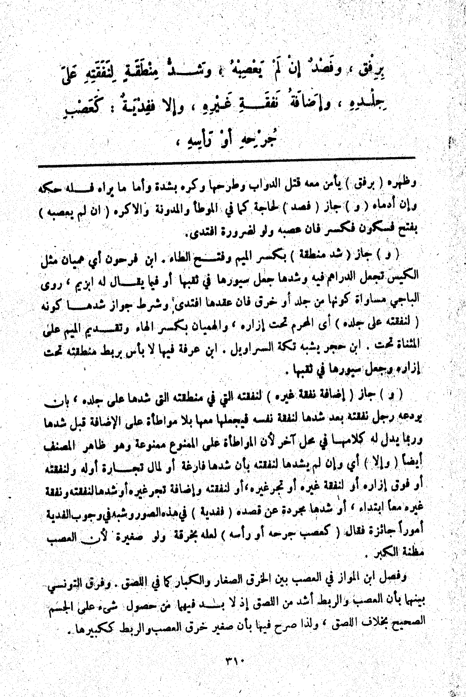 (وَ) جَازَ (شَدُّ مِنْطَقَةٍ) بِكَسْرِ الْمِيمِ وَفَتْحِ الطَّاءِ ابْنُ فَرْحُونٍ أَيْ: هِمْيَانٍ مِثْلِ الْكِيسِ تُجْعَلُ الدَّرَاهِمُ فِيهِ وَشَدُّهَا جَعْلُ سُيُورِهَا فِي ثُقْبِهَا أَوْ فِيمَا يُقَالُ لَهُ إبْزِيمٌ، رَوَى الْبَاجِيَّ مُسَاوَاةَ كَوْنِهَا مِنْ جِلْدٍ أَوْ خُرْقٍ فَإِنْ عَقَدَهَا افْتَدَى وَشَرْطُ جَوَازِ شَدِّهَا كَوْنُهُ (لِنَفَقَتِهِ عَلَى جِلْدِهِ) أَيْ الْمُحْرِمِ تَحْتَ إزَارِهِ، وَالْهِمْيَانُ بِكَسْرِ الْهَاءِ وَتَقْدِيمِ الْمِيمِ عَلَى الْمُثَنَّاةِ تَحْتُ. ابْنُ حَجَرٍ يُشْبِهُ تِكَّةَ السَّرَاوِيلِ. ابْنُ عَرَفَةَ فِيهَا لَا بَأْسَ بِرَبْطِ مِنْطَقَتِهِ تَحْتَ إزَارِهِ وَجَعْلِ سُيُورِهَا فِي ثُقْبِهَا. (وَ) جَازَ (إضَافَةُ نَفَقَةِ غَيْرِهِ) لِنَفَقَتِهِ الَّتِي فِي مِنْطَقَتِهِ الَّتِي شَدَّهَا عَلَى جِلْدِهِ، بِأَنْ يُودِعَهُ رَجُلٌ نَفَقَتَهُ بَعْدَ شَدِّهَا لِنَفَقَةِ نَفْسِهِ فَيَجْعَلُهَا مَعَهَا بِلَا مُوَاطَأَةٍ عَلَى الْإِضَافَةِ قَبْلَ شَدِّهَا وَرُبَّمَا يَدُلُّ لَهُ كَلَامُهَا فِي مَحَلٍّ آخَرَ؛ لِأَنَّ الْمُوَاطَأَةَ عَلَى الْمَمْنُوعِ مَمْنُوعَةٌ وَهُوَ ظَاهِرُ الْمُصَنِّفِ أَيْضًا (وَإِلَّا) أَيْ: وَإِنْ لَمْ يَشُدَّهَا لِنَفَقَتِهِ بِأَنْ شَدَّهَا فَارِغَةً أَوْ لِمَالِ تِجَارَةٍ أَوْ لَهُ وَلِنَفَقَتِهِ أَوْ فَوْقَ إزَارِهِ أَوْ لِنَفَقَةِ غَيْرِهِ أَوْ تَجْرِ غَيْرِهِ، أَوْ لِنَفَقَتِهِ وَإِضَافَةُ تَجْرِ غَيْرِهِ أَوْ شَدُّهَا لِنَفَقَتِهِ وَنَفَقَةِ غَيْرِهِ مَعًا ابْتِدَاءً، أَوْ شَدُّهَا مُجَرَّدَةً عَنْ قَصْدِهِ (فَفِدْيَةٌ) فِي هَذِهِ الصُّوَرِ وَشَبَّهَ فِي وُجُوبِ الْفِدْيَةِ أُمُورًا جَائِزَةً فَقَالَ (كَعَصْبِ جُرْحِهِ أَوْ رَأْسِهِ) لَعَلَّهُ بِخِرْقَةٍ وَلَوْ صَغِيرَةً؛ لِأَنَّ الْعَصْبَ مَظِنَّةُ الْكِبَرِ.