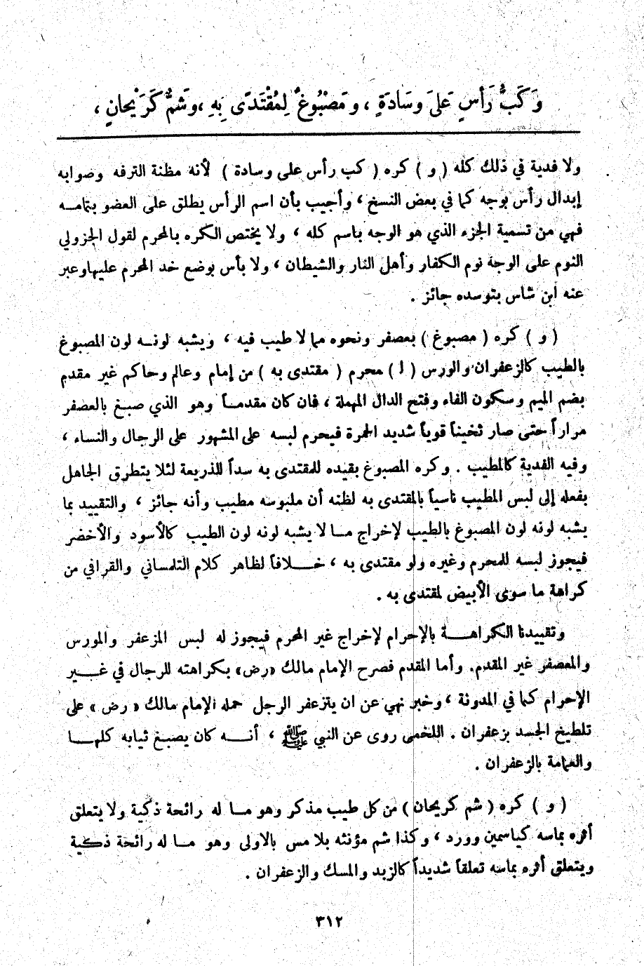 (وَ) كُرِهَ (مَصْبُوغٌ) بِعُصْفُرٍ وَنَحْوَهُ مِمَّا لَا طِيبَ فِيهِ، وَيُشْبِهُ لَوْنُهُ لَوْنَ الْمَصْبُوغِ بِالطِّيبِ كَالزَّعْفَرَانِ وَالْوَرْسِ (لِ) مُحْرِمٍ (مُقْتَدًى بِهِ) مِنْ إمَامٍ وَعَالِمٍ وَحَاكِمٍ غَيْرِ مُقَدَّمٍ بِضَمِّ الْمِيمِ وَسُكُونِ الْقَافِ وَفَتْحِ الدَّالِ الْمُهْمَلَةِ، فَإِنْ كَانَ مُقَدَّمًا وَهُوَ الَّذِي صُبِغَ بِالْعُصْفُرِ مِرَارًا حَتَّى صَارَ ثَخِينًا قَوِيًّا شَدِيدَ الْحُمْرَةِ فَيَحْرُمُ لُبْسُهُ عَلَى الْمَشْهُورِ عَلَى الرِّجَالِ وَالنِّسَاءِ، وَفِيهِ الْفِدْيَةُ كَالْمُطَيَّبِ. وَكُرِهَ الْمَصْبُوغُ بِقَيْدِهِ لِلْمُقْتَدَى بِهِ سَدًّا لِلذَّرِيعَةِ لِئَلَّا يَتَطَرَّقَ الْجَاهِلُ بِفِعْلِهِ إلَى لُبْسِ الْمُطَيَّبِ تَأَسِّيًا بِالْمُقْتَدَى بِهِ لِظَنِّهِ أَنَّ مَلْبُوسَهُ مُطَيَّبٌ وَأَنَّهُ جَائِزٌ، وَالتَّقْيِيدُ بِمَا يُشْبِهُ لَوْنُهُ لَوْنَ الْمَصْبُوغِ بِالطِّيبِ لِإِخْرَاجِ مَا لَا يُشْبِهُ لَوْنُهُ لَوْنَ الطِّيبِ كَالْأَسْوَدِ وَالْأَخْضَرِ فَيَجُوزُ لُبْسُهُ لِلْمُحْرِمِ وَغَيْرِهِ وَلَوْ مُقْتَدًى بِهِ، خِلَافًا لِظَاهِرِ كَلَامِ التِّلِمْسَانِيِّ وَالْقَرَافِيِّ مِنْ كَرَاهَةِ مَا سِوَى الْأَبْيَضِ لِمُقْتَدًى بِهِ.