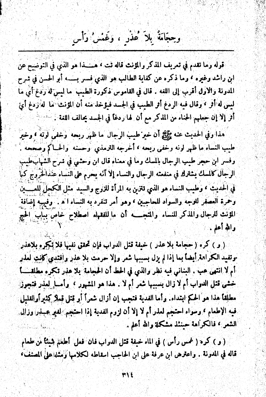 ـــــــــــــــــــــــــــــQقَوْلُهُ وَمَا تَقَدَّمَ فِي تَعْرِيفِ الْمُذَكَّرِ وَالْمُؤَنَّثِ قَالَهُ تت، هَذَا هُوَ الَّذِي فِي التَّوْضِيحِ عَنْ ابْنِ رَاشِدٍ وَغَيْرِهِ، وَمَا ذَكَرَهُ عَنْ كِفَايَةِ الطَّالِبِ هُوَ الَّذِي فَسَّرَ بِهِ أَبُو الْحَسَنِ فِي شَرْحِ الْمُدَوَّنَةِ وَالْأَوَّلُ أَقْرَبُ إلَى اللُّغَةِ. قَالَ فِي الْقَامُوسِ ذُكُورَةُ الطِّيبِ مَا لَيْسَ لَهُ رَدْغٌ أَيْ: مَا لَيْسَ لَهُ أَثَرٌ، وَقَالَ فِيهِ الرَّدْغُ أَثَرُ الطِّيبِ فِي الْجَسَدِ فَيُؤْخَذُ مِنْهُ أَنَّ الْمُؤَنَّثَ مَا لَهُ رَدْغٌ أَيْ: أَثَرٌ إلَّا أَنَّ جَعْلَهُمْ الْحِنَّاءَ مِنْ الْمُذَكَّرِ مَعَ أَنَّ لَهَا رَدْغًا فِي الْجَسَدِ يُخَالِفُ اللُّغَةَ.