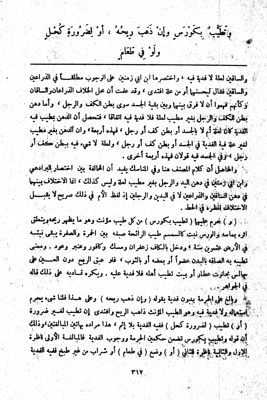 وَالْحَاصِلُ أَنَّ كَلَامَ الْمُصَنِّفِ هُنَا وَفِي الْمَنَاسِكِ يُفِيدُ أَنَّ الْمُخَالَفَةَ بَيْنَ اخْتِصَارِ الْبَرَادِعِيِّ وَابْنِ أَبِي زَمَنِينَ فِي دَهْنِ الْيَدِ وَالرِّجْلِ بِغَيْرِ مُطَيِّبٍ لِعِلَّةٍ وَلَيْسَ كَذَلِكَ، إنَّمَا الِاخْتِلَافُ بَيْنَهُمَا فِي دَهْنِ السَّاقَيْنِ وَالذِّرَاعَيْنِ لَا فِي الْيَدَيْنِ وَالرِّجْلَيْنِ إذْ لَفْظُ الْأُمِّ فِي ذَلِكَ صَرِيحٌ لَا يَقْبَلُ الِاخْتِلَافَ اُنْظُرْهُ فِي الْحَطّ.