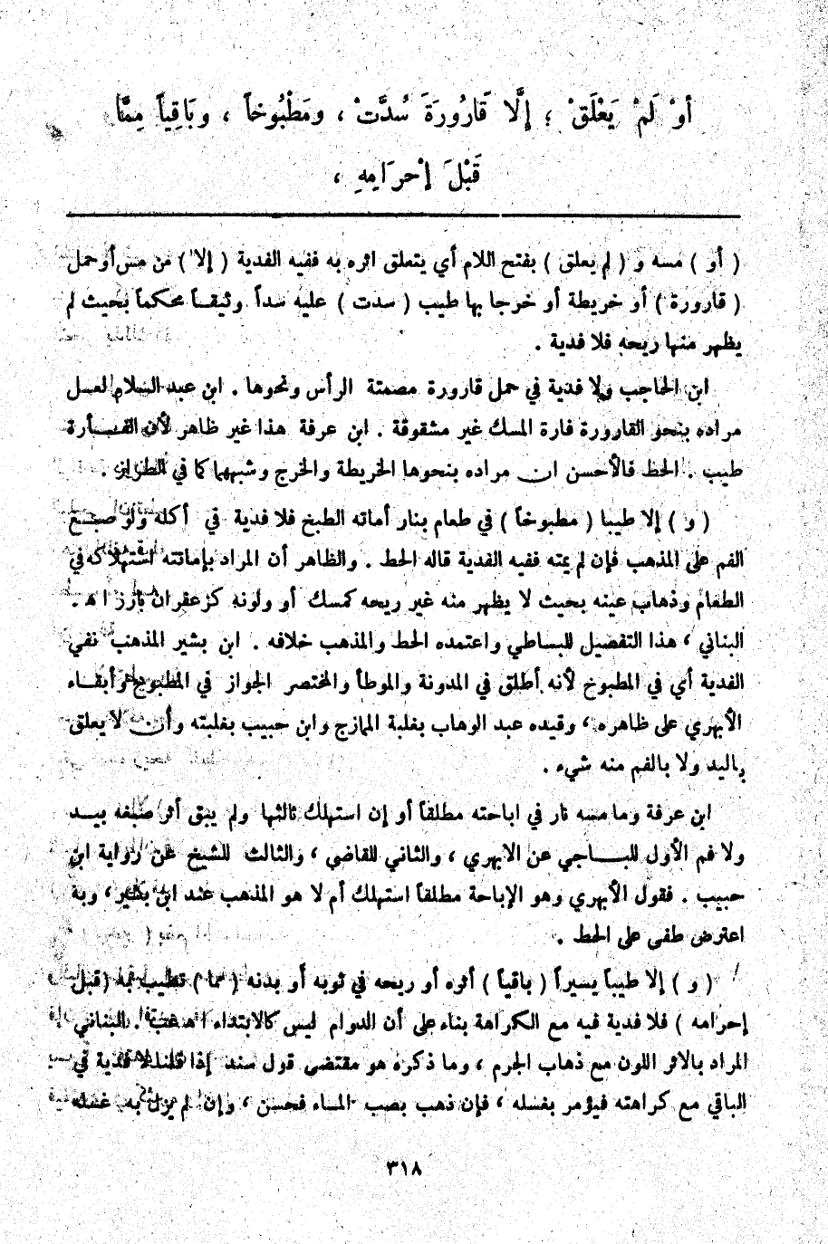 ابْنُ الْحَاجِبِ وَلَا فِدْيَةَ فِي حَمْلِ قَارُورَةٍ مُصْمَتَةِ الرَّأْسِ وَنَحْوِهَا. ابْنُ عَبْدِ السَّلَامِ لَعَلَّ مُرَادَهُ بِنَحْوِ الْقَارُورَةِ فَارَةُ الْمِسْكِ غَيْرُ مَشْقُوقَةٍ. ابْنُ عَرَفَةَ هَذَا غَيْرُ ظَاهِرٍ؛ لِأَنَّ الْفَأْرَةَ طِيبٌ. الْحَطّ فَالْأَحْسَنُ أَنَّ مُرَادَهُ بِنَحْوِهَا الْخَرِيطَةُ وَالْخُرْجُ وَشَبَهُهُمَا كَمَا فِي الطِّرَازِ.