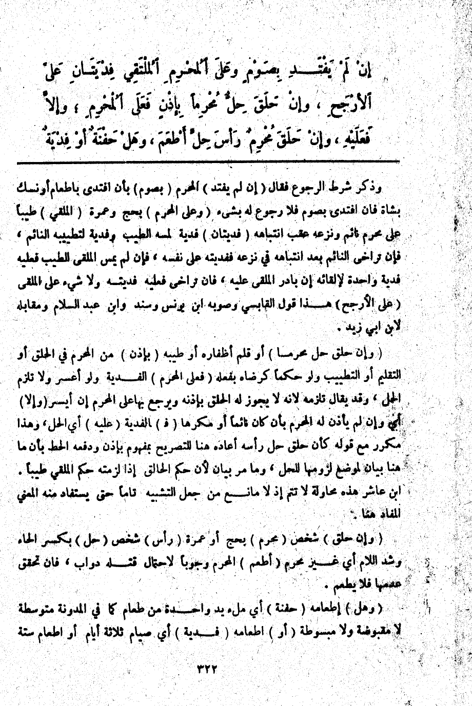 (وَإِنْ حَلَقَ حِلٌّ مُحْرِمًا) أَوْ قَلَّمَ أَظْفَارَهُ أَوْ طَيَّبَهُ (بِإِذْنٍ) مِنْ الْمُحْرِمِ فِي الْحَلْقِ أَوْ التَّقْلِيمِ أَوْ التَّطْيِيبِ وَلَوْ حُكْمًا كَرِضَاهُ بِفِعْلِهِ (فَعَلَى الْمُحْرِمِ) الْفِدْيَةُ وَلَوْ أَعْسَرَ وَلَا تَلْزَمُ الْحِلَّ، وَقَدْ يُقَالُ تَلْزَمُهُ؛ لِأَنَّهُ لَا يَجُوزُ لَهُ الْحَلْقُ بِإِذْنِهِ وَيَرْجِعُ بِهَا عَلَى الْمُحْرِمِ إنْ أَيْسَرَ (وَإِلَّا) أَيْ: وَإِنْ لَمْ يَأْذَنْ لَهُ الْمُحْرِمُ بِأَنْ كَانَ نَائِمًا أَوْ مُكْرَهًا (فَ) الْفِدْيَةُ (عَلَيْهِ) أَيْ: الْحِلِّ، وَهَذَا مُكَرَّرٌ مَعَ قَوْلِهِ كَأَنْ حَلَقَ حِلٌّ رَأْسَهُ أَعَادَهُ هُنَا لِلتَّصْرِيحِ بِمَفْهُومٍ بِإِذْنٍ وَدَفَعَهُ الْحَطّ بِأَنَّ مَا هُنَا بَيَانٌ لِمَوْضِعِ لُزُومِهَا لِلْحِلِّ وَمَا مَرَّ بَيَانٌ؛ لِأَنَّ حُكْمَ الْحَالِقِ إذَا لَزِمَتْهُ حُكْمُ الْمُلْقِي طِيبًا. ابْنُ عَاشِرٍ هَذِهِ مُحَاوَلَةٌ لَا تَتِمُّ إذْ لَا مَانِعَ مِنْ جَعْلِ التَّشْبِيهِ تَامًّا حَتَّى يُسْتَفَادَ مِنْهُ الْمَعْنَى الْمُفَادُ هُنَا.