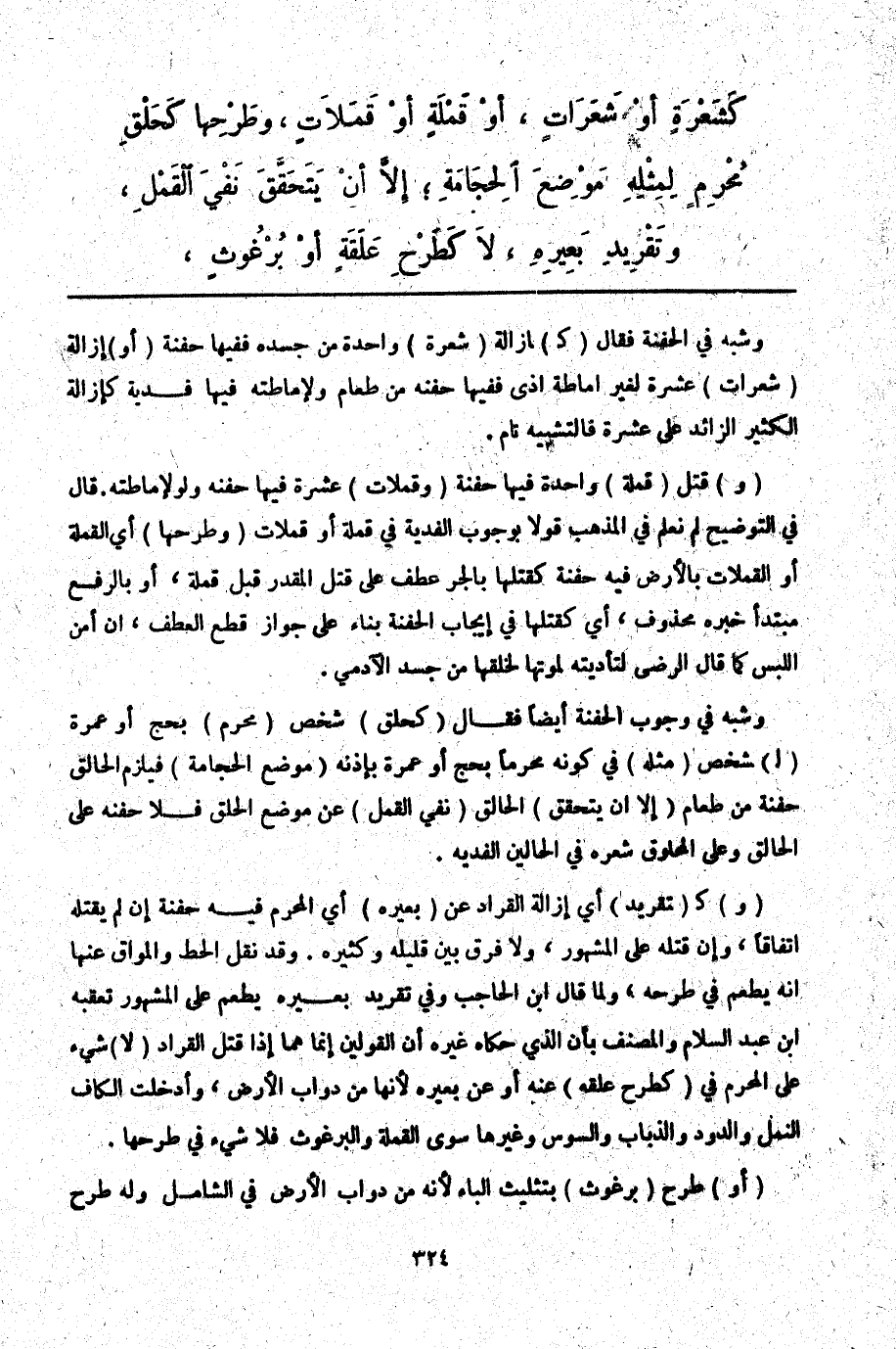 ـــــــــــــــــــــــــــــQوَشَبَّهَ فِي الْحَفْنَةِ فَقَالَ (كَ) إزَالَةِ (شَعْرَةٍ) وَاحِدَةٍ مِنْ جَسَدِهِ فَفِيهَا حَفْنَةٌ (أَوْ) إزَالَةِ (شَعَرَاتٍ) عَشْرَةٍ لِغَيْرِ إمَاطَةِ أَذًى فَفِيهَا حَفْنَةٌ مِنْ طَعَامٍ وَلِإِمَاطَتِهِ فِيهَا فِدْيَةٌ كَإِزَالَةِ الْكَثِيرِ الزَّائِدِ عَلَى عَشَرَةٍ فَالتَّشْبِيهُ تَامٌّ.