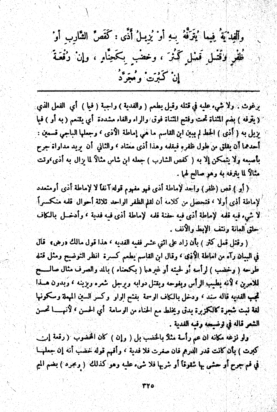 ـــــــــــــــــــــــــــــQبُرْغُوثٍ. وَلَا شَيْءَ عَلَيْهِ فِي قَتْلِهِ وَقِيلَ يُطْعِمُ (وَالْفِدْيَةُ) وَاجِبَةٌ (فِيمَا) أَيْ: الْفِعْلِ الَّذِي (يُتَرَفَّهُ) بِضَمِّ الْمُثَنَّاةِ تَحْتُ وَفَتْحِ الْمُثَنَّاةِ فَوْقُ وَالرَّاءُ وَالْفَاءُ مُشَدَّدَةٌ أَيْ: يَتَنَعَّمُ (بِهِ أَوْ) فِيمَا يُزِيلُ بِهِ (أَذَى) الْحَطّ لَمْ يُبَيِّنْ ابْنُ الْقَاسِمِ مَا هِيَ إمَاطَةُ الْأَذَى، وَجَعَلَهَا الْبَاجِيَّ قِسْمَيْنِ: أَحَدُهُمَا أَنْ يَقْلَقَ مِنْ طُولِ ظُفْرِهِ فَيُقَلِّمُهُ وَهَذَا أَذًى مُعْتَادٌ، وَالثَّانِي أَنْ يُرِيدَ مُدَاوَاةَ جُرْحٍ بِأُصْبُعِهِ وَلَا يَتَمَكَّنُ إلَّا بِهِ (كَقَصِّ الشَّارِبِ) جَعَلَهُ ابْنُ شَاسٍ مِثَالًا لِمَا يُزَالُ بِهِ أَذًى وتت مِثَالًا لِمَا يُتَرَفَّهُ بِهِ وَهُوَ صَالِحٌ لَهُمَا.