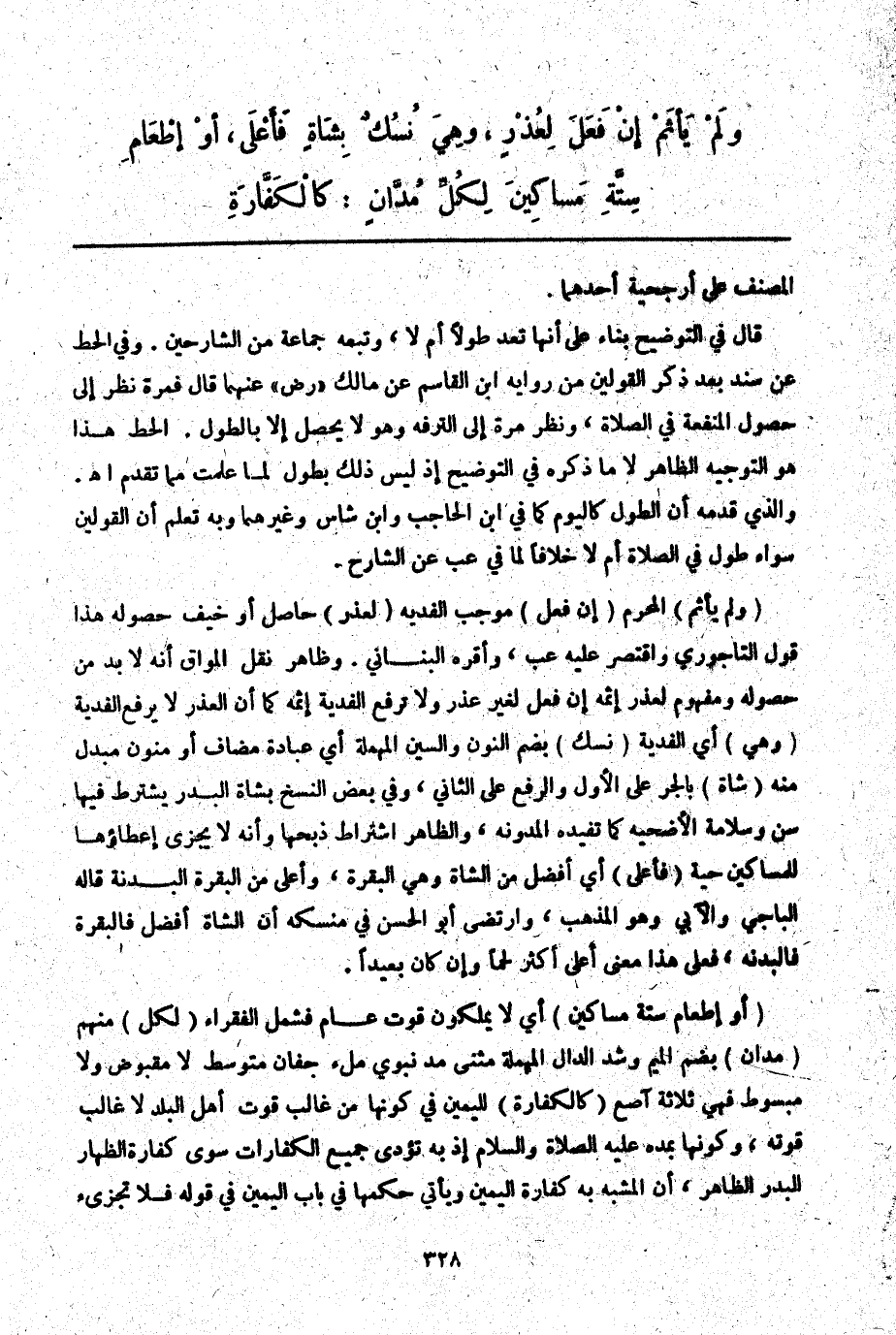 (وَلَمْ يَأْثَمْ) الْمُحْرِمُ (إنْ فَعَلَ) مُوجِبَ الْفِدْيَةِ (لِعُذْرٍ) حَاصِلٍ أَوْ خِيفَ حُصُولُهُ هَذَا قَوْلُ التَّاجُورِيِّ وَاقْتَصَرَ عَلَيْهِ عب، وَأَقَرَّهُ الْبُنَانِيُّ. وَظَاهِرُ نَقْلِ الْمَوَّاقِ أَنَّهُ لَا بُدَّ مِنْ حُصُولِهِ وَمَفْهُومٌ لِعُذْرِ إثْمِهِ إنْ فَعَلَ لِغَيْرِ عُذْرٍ وَلَا تَرْفَعُ الْفِدْيَةُ إثْمَهُ كَمَا أَنَّ الْعُذْرَ لَا يَرْفَعُ الْفِدْيَةَ (وَهِيَ) أَيْ: الْفِدْيَةُ (نُسُكٌ) بِضَمِّ النُّونِ وَالسِّينِ الْمُهْمَلَةِ أَيْ: عِبَادَةٌ مُضَافٌ أَوْ مُنَوَّنٌ مُبْدَلٌ مِنْهُ (شَاةٍ) بِالْجَرِّ عَلَى الْأَوَّلِ وَالرَّفْعِ عَلَى الثَّانِي، وَفِي بَعْضِ النُّسَخِ بِشَاةٍ الْبَدْرِ يُشْتَرَطُ فِيهَا سِنٌّ وَسَلَامَةُ الْأُضْحِيَّةِ كَمَا تُفِيدُهُ الْمُدَوَّنَةُ وَالظَّاهِرُ اشْتِرَاطُ ذَبْحِهَا وَأَنَّهُ لَا يُجْزِي إعْطَاؤُهَا لِلْمَسَاكِينِ حَيَّةً (فَأَعْلَى) أَيْ: أَفْضَلُ مِنْ الشَّاةِ وَهِيَ الْبَقَرَةُ، وَأَعْلَى مِنْ الْبَقَرَةِ الْبَدَنَةُ قَالَهُ الْبَاجِيَّ وَالْآبِيُّ وَهُوَ الْمَذْهَبُ، وَارْتَضَى أَبُو الْحَسَنِ فِي مَنْسَكِهِ أَنَّ الشَّاةَ أَفْضَلُ فَالْبَقَرَةُ فَالْبَدَنَةُ، فَعَلَى هَذَا مَعْنَى أَعْلَى أَكْثَرُ لَحْمًا وَإِنْ كَانَ بَعِيدًا.