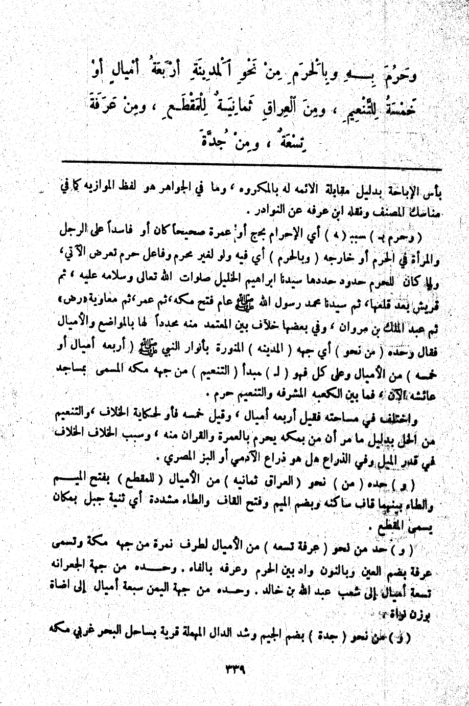 وَاخْتُلِفَ فِي مِسَاحَتِهِ فَقِيلَ أَرْبَعَةُ أَمْيَالٍ، وَقِيلَ خَمْسَةٌ فَأَوْ لِحِكَايَةِ الْخِلَافِ وَالتَّنْعِيمِ مِنْ الْحِلِّ بِدَلِيلِ مَا مَرَّ أَنَّ مَنْ بِمَكَّةَ يُحْرِمُ بِالْعُمْرَةِ وَالْقِرَانِ مِنْهُ، وَسَبَبُ الْخِلَافِ الْخِلَافُ فِي قَدْرِ الْمِيلِ وَفِي الذِّرَاعِ هَلْ هُوَ ذِرَاعُ الْآدَمِيِّ أَوْ الْبَزِّ الْمِصْرِيِّ.