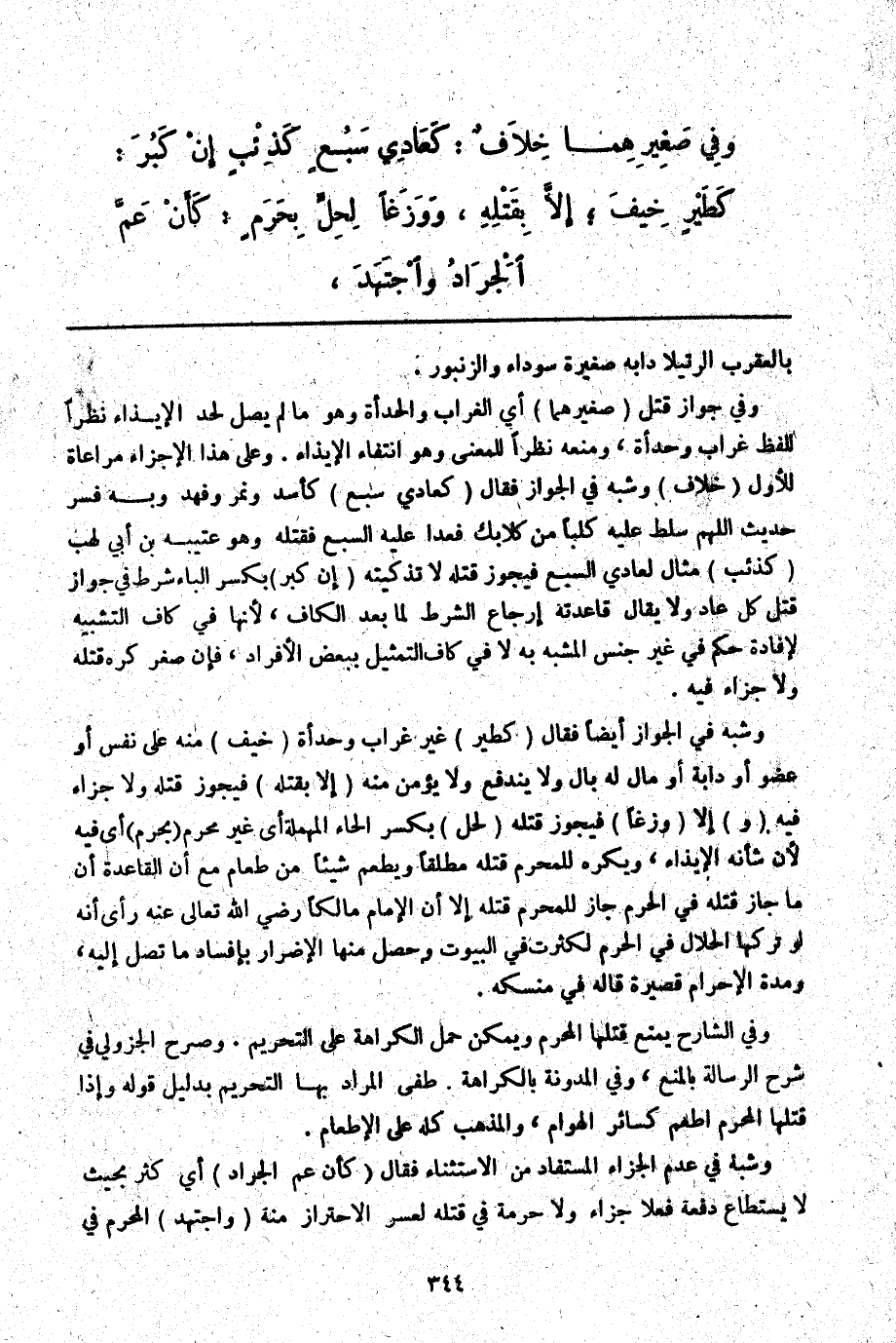 وَفِي جَوَازِ قَتْلِ (صَغِيرِهِمَا) أَيْ: الْغُرَابِ وَالْحِدَأَةِ وَهُوَ مَا لَمْ يَصِلْ لِحَدِّ الْإِيذَاءِ نَظَرًا لِلَفْظِ غُرَابٍ وَحِدَأَةٍ، وَمَنَعَهُ نَظَرًا لِلْمَعْنَى وَهُوَ انْتِفَاءُ الْإِيذَاءِ. وَعَلَى هَذَا الْإِجْزَاءُ مُرَاعَاةً لِلْأَوَّلِ (خِلَافٌ) وَشَبَّهَ فِي الْجَوَازِ فَقَالَ (كَعَادِي سَبُعٍ) كَأَسَدٍ وَنَمِرٍ وَفَهْدٍ وَبِهِ فَسَّرَ حَدِيثَ «اللَّهُمَّ سَلِّطْ عَلَيْهِ كَلْبًا مِنْ كِلَابِك فَعَدَا عَلَيْهِ السَّبُعُ فَقَتَلَهُ وَهُوَ عُتَيْبَةُ بْنُ أَبِي لَهَبٍ» (كَذِئْبٍ) مِثَالٌ لِعَادِي السَّبُعِ فَيَجُوزُ قَتْلُهُ لَا تَذْكِيَتُهُ (إنْ كَبِرَ) بِكَسْرِ الْبَاءِ شَرْطٌ فِي جَوَازِ قَتْلِ كُلِّ عَادٍ وَلَا يُقَالُ قَاعِدَتُهُ إرْجَاعُ الشَّرْطِ لِمَا بَعْدَ الْكَافِ؛ لِأَنَّهَا فِي كَافِ التَّشْبِيهِ لِإِفَادَةِ حُكْمٍ فِي غَيْرِ جِنْسِ الْمُشَبَّهِ بِهِ لَا فِي كَافِ التَّمْثِيلِ بِبَعْضِ الْأَفْرَادِ، فَإِنْ صَغُرَ كُرِهَ قَتْلُهُ وَلَا جَزَاءَ فِيهِ.