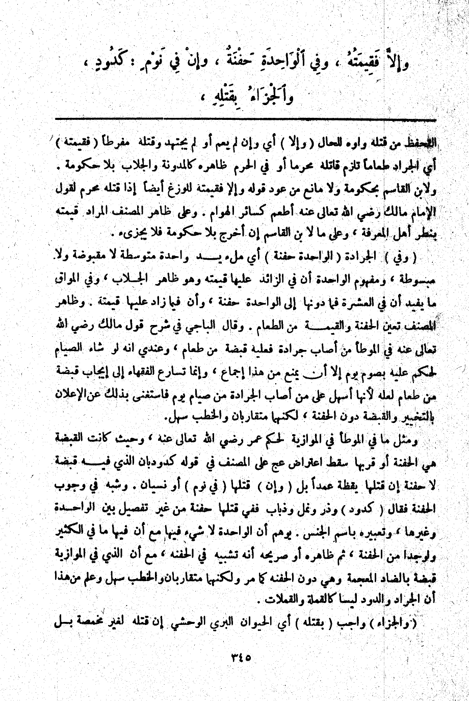 ـــــــــــــــــــــــــــــQالتَّحَفُّظِ مِنْ قَتْلِهِ وَاوُهُ لِلْحَالِ (وَإِلَّا) أَيْ: وَإِنْ لَمْ يَعُمَّ أَوْ لَمْ يَجْتَهِدْ وَقَتَلَهُ مُفَرِّطًا (فَقِيمَتُهُ) أَيْ الْجَرَادِ طَعَامًا تَلْزَمُ قَاتِلَهُ مُحْرِمًا أَوْ فِي الْحَرَمِ ظَاهِرُهُ كَالْمُدَوَّنَةِ وَالْجَلَّابِ بِلَا حُكُومَةٍ. وَلِابْنِ الْقَاسِمِ بِحُكُومَةٍ وَلَا مَانِعَ مِنْ عَوْدِ قَوْلِهِ وَإِلَّا فَقِيمَتُهُ لِلْوَزَغِ أَيْضًا إذَا قَتَلَهُ مُحْرِمٌ لِقَوْلِ الْإِمَامِ مَالِكٍ - رَضِيَ اللَّهُ تَعَالَى عَنْهُ - أَطْعِمْ كَسَائِرِ الْهَوَامِّ. وَعَلَى ظَاهِرِ الْمُصَنِّفِ الْمُرَادُ قِيمَتُهُ بِنَظَرِ أَهْلِ الْمَعْرِفَةِ، وَعَلَى مَا لِابْنِ الْقَاسِمِ إنْ أَخْرَجَ بِلَا حُكُومَةٍ فَلَا يُجْزِئُ.