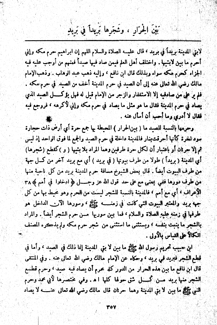 ابْنُ حَبِيبٍ تَحْرِيمُ رَسُولِ اللَّهِ - صَلَّى اللَّهُ عَلَيْهِ وَسَلَّمَ - مَا بَيْنَ لَابَتَيْ الْمَدِينَةِ إنَّمَا ذَلِكَ فِي الصَّيْدِ، وَأَمَّا فِي قَطْعِ الشَّجَرِ فَبَرِيدٌ فِي بَرِيدٍ، وَحَكَاهُ عَنْ الْإِمَامِ مَالِكٍ - رَضِيَ اللَّهُ تَعَالَى عَنْهُ -. وَفِي الْمُنْتَقَى قَالَ ابْنُ نَافِعٍ مَا بَيْنَ هَذِهِ الْحِرَارِ مِنْ الدُّورِ كُلُّهُ مُحَرَّمٌ أَنْ يُصَادَ فِيهِ صَيْدٌ، وَحَرُمَ قَطْعُ الشَّجَرِ مِنْهَا يُرِيدُ مِنْ كُلِّ شِقٍّ حَوْلَهَا كُلِّهَا اهـ. وَفِي مُخْتَصَرِهَا لِأَبِي مُحَمَّدٍ وَحَرَّمَ النَّبِيُّ - صَلَّى اللَّهُ عَلَيْهِ وَسَلَّمَ - مَا بَيْنَ لَابَتَيْ الْمَدِينَةِ وَهُمَا حَرَّتَانِ قَالَ مَالِكٌ - رَضِيَ اللَّهُ تَعَالَى عَنْهُ - لَا يُصَادُ