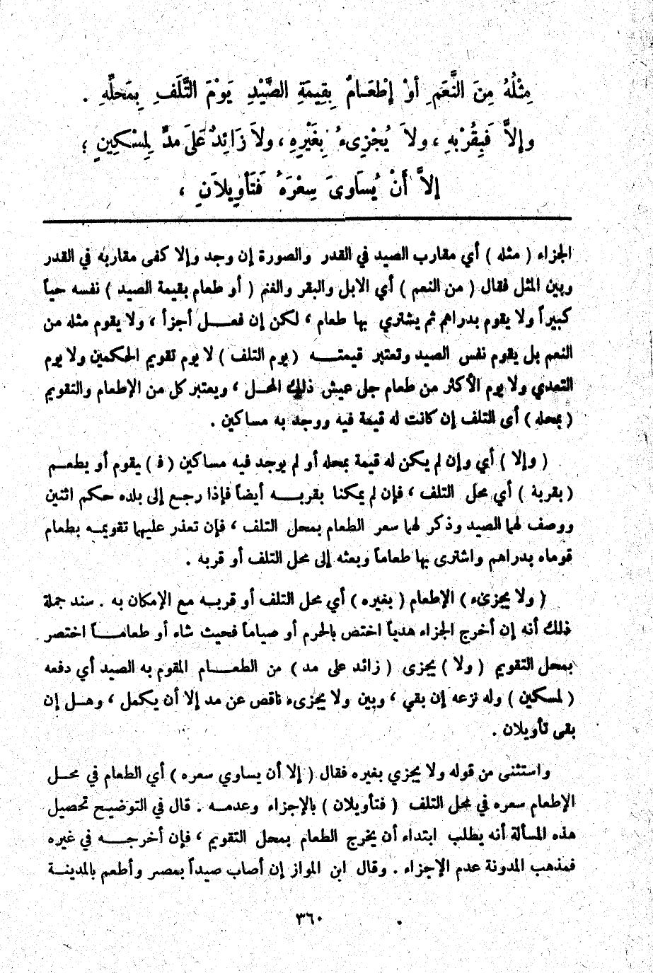 ـــــــــــــــــــــــــــــQالْجَزَاءِ (مِثْلُهُ) أَيْ مُقَارِبُ الصَّيْدِ فِي الْقَدْرِ وَالصُّورَةِ إنْ وُجِدَ وَإِلَّا كَفَى مُقَارِبُهُ فِي الْقَدْرِ وَبَيَّنَ الْمِثْلَ فَقَالَ (مِنْ النَّعَمِ) أَيْ: الْإِبِلِ وَالْبَقَرِ وَالْغَنَمِ (أَوْ إطْعَامٌ بِقِيمَةِ الصَّيْدِ) نَفْسِهِ حَيًّا كَبِيرًا وَلَا يُقَوِّمُ بِدَرَاهِمَ ثُمَّ يَشْتَرِي بِهَا طَعَامًا، لَكِنْ إنْ فَعَلَ أَجْزَأَ، وَلَا يُقَوِّمُ مِثْلَهُ مِنْ النَّعَمِ بَلْ يُقَوِّمُ نَفْسَ، الصَّيْدِ وَتُعْتَبَرُ قِيمَتُهُ (يَوْمَ التَّلَفِ) لَا يَوْمَ تَقْوِيمِ الْحَكَمَيْنِ وَلَا يَوْمَ التَّعَدِّي وَلَا يَوْمَ الْأَكْثَرِ مِنْ طَعَامِ جُلِّ عَيْشِ ذَلِكَ الْمَحَلِّ، وَيُعْتَبَرُ كُلٌّ مِنْ الْإِطْعَامِ وَالتَّقْوِيمِ (بِمَحَلِّهِ) أَيْ التَّلَفِ إنْ كَانَتْ لَهُ قِيمَةٌ فِيهِ وَوَجَدَ بِهِ مَسَاكِينَ.