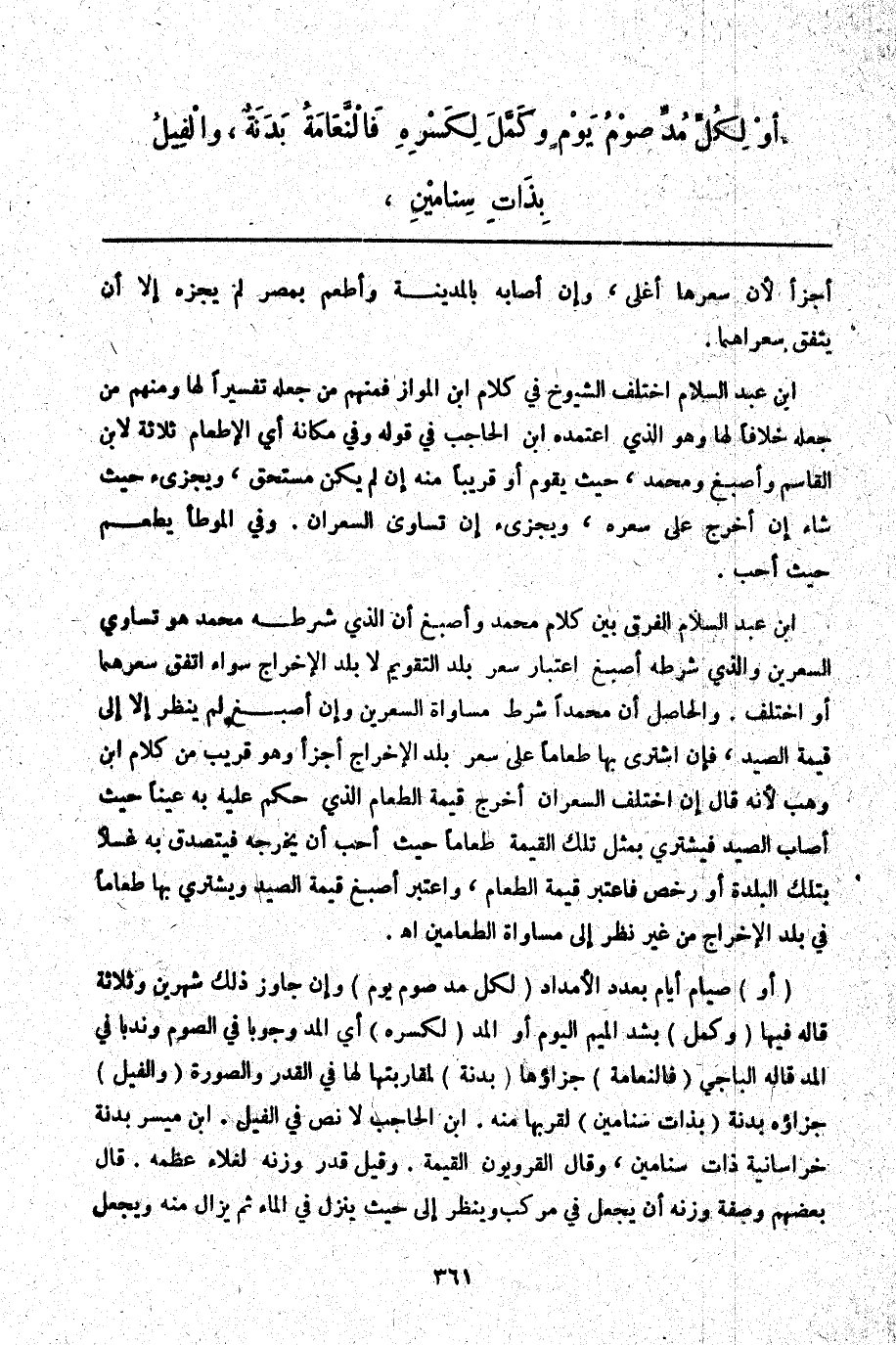 (أَوْ) صِيَامُ أَيَّامٍ بِعَدَدِ الْأَمْدَادِ (لِكُلِّ مُدٍّ صَوْمُ يَوْمٍ) وَإِنْ جَاوَزَ ذَلِكَ شَهْرَيْنِ وَثَلَاثَةً قَالَهُ فِيهَا (وَكَمَّلَ) بِشَدِّ الْمِيمِ الْيَوْمَ أَوْ الْمُدَّ (لِكَسْرِهِ) أَيْ الْمُدِّ وُجُوبًا فِي الصَّوْمِ وَنَدْبًا فِي الْمُدِّ قَالَهُ الْبَاجِيَّ (فَالنَّعَامَةُ) جَزَاؤُهَا (بَدَنَةٌ) لِمُقَارَبَتِهَا لَهَا فِي الْقَدْرِ وَالصُّورَةِ (وَالْفِيلُ) جَزَاؤُهُ بَدَنَةٌ (بِذَاتِ سَنَامَيْنِ) لِقُرْبِهَا مِنْهُ. ابْنُ الْحَاجِبِ لَا نَصَّ فِي الْفِيلِ. ابْنُ مُيَسِّرٍ بَدَنَةٌ خُرَاسَانِيَّةٌ ذَاتُ سَنَامَيْنِ، وَقَالَ الْقَرَوِيُّونَ الْقِيمَةُ. وَقِيلَ قَدْرُ وَزْنِهِ لِغَلَاءِ عَظْمِهِ. قَالَ بَعْضُهُمْ: وَصِفَةُ وَزْنِهِ أَنْ يَجْعَلَ فِي مَرْكَبٍ وَيَنْظُرَ إلَى حَيْثُ يَنْزِلُ فِي الْمَاءِ ثُمَّ يُزَالُ مِنْهُ وَيُجْعَلُ