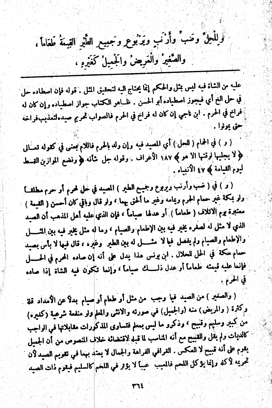 (وَالصَّغِيرُ) مِنْ الصَّيْدِ فِيمَا وَجَبَ مِنْ مِثْلٍ أَوْ طَعَامٍ أَوْ صِيَامٍ بَدَلًا عَنْ الْأَمْدَادِ قِلَّةً وَكَثْرَةً (وَالْمَرِيضُ) مِنْهُ (وَالْجَمِيلُ) فِي صُورَتِهِ وَالْأُنْثَى وَالْمُعَلَّمُ وَلَوْ مَنْفَعَةً شَرْعِيَّةً (كَغَيْرِهِ) مِنْ كَبِيرٍ وَسَلِيمٍ وَقَبِيحٍ، وَذَكَرُوا مَا لَيْسَ بِمُعَلَّمٍ فَتَسَاوِي الْمَذْكُورَاتِ مُقَابِلَاتُهَا فِي الْوَاجِبِ كَالدِّيَاتِ وَلَمْ يَقُلْ وَالْقَبِيحُ مَعَ أَنَّهُ الْمُنَاسِبُ لِمَا قَبْلَهُ لِاقْتِضَائِهِ خِلَافَ الْمَنْصُوصِ مِنْ أَنَّ الْجَمِيلَ يُقَوَّمُ عَلَى أَنَّهُ قَبِيحٌ لَا الْعَكْسُ. الْقَرَافِيُّ الْفَرَاهَةُ وَالْجَمَالُ لَا يُعْتَدُّ بِهِمَا فِي تَقْوِيمِ الصَّيْدِ؛ لِأَنَّ تَحْرِيمَهُ لِأَكْلِهِ وَإِنَّمَا يُؤْكَلُ اللَّحْمُ فَالْمَعِيبُ عَيْبًا لَا يُؤَثِّرُ فِي اللَّحْمِ كَالسَّلِيمِ فَيُقَوِّمُ ذَاتَ الصَّيْدِ