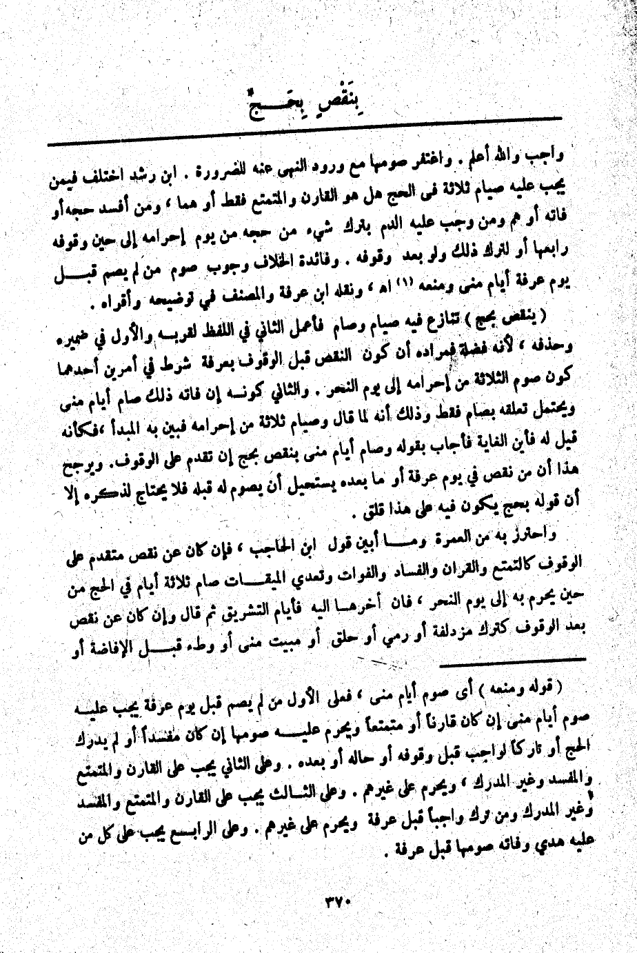 وَاحْتُرِزَ بِهِ مِنْ الْعُمْرَةِ وَمَا أَبَيْنَ قَوْلَ ابْنِ الْحَاجِبِ، فَإِنْ كَانَ عَنْ نَقْصٍ مُتَقَدِّمٍ عَلَى الْوُقُوفِ كَالتَّمَتُّعِ وَالْقِرَانِ وَالْفَسَادِ وَالْفَوَاتِ وَتَعَدَّى الْمِيقَاتَ صَامَ ثَلَاثَةَ أَيَّامٍ فِي الْحَجِّ مِنْ حِينِ يُحْرِمُ بِهِ إلَى يَوْمِ النَّحْرِ، فَإِنْ أَخَّرَهَا إلَيْهِ فَأَيَّامُ التَّشْرِيقِ ثُمَّ قَالَ وَإِنْ كَانَ عَنْ نَقْصٍ بَعْدَ الْوُقُوفِ كَتَرْكِ مُزْدَلِفَةَ أَوْ رَمْيٍ أَوْ حَلْقٍ أَوْ مَبِيتِ مِنًى أَوْ وَطِئَ قَبْلَ الْإِفَاضَةِ أَوْ