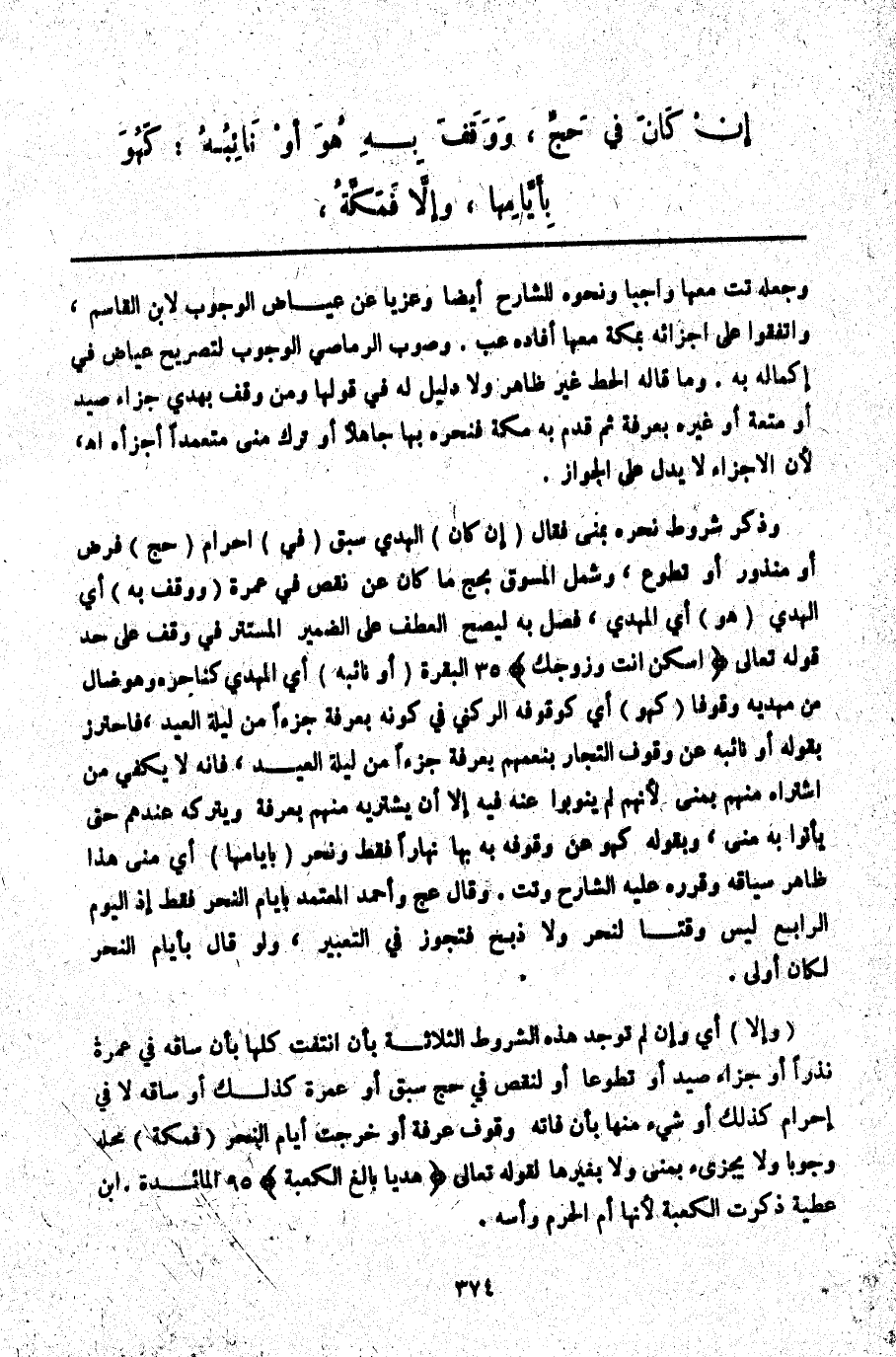 (وَإِلَّا) أَيْ: وَإِنْ لَمْ تُوجَدْ هَذِهِ الشُّرُوطُ الثَّلَاثَةُ بِأَنْ انْتَفَتْ كُلُّهَا بِأَنْ سَاقَهُ فِي عُمْرَةٍ نَذْرًا أَوْ جَزَاءَ صَيْدٍ أَوْ تَطَوُّعًا أَوْ لِنَقْصٍ فِي حَجٍّ سَبَقَ أَوْ عُمْرَةٍ كَذَلِكَ أَوْ سَاقَهُ لَا فِي إحْرَامٍ كَذَلِكَ أَوْ شَيْءٍ مِنْهَا بِأَنْ فَاتَهُ وُقُوفُ عَرَفَةَ أَوْ خَرَجَتْ أَيَّامُ النَّحْرِ (فَمَكَّةُ) مَحَلُّهُ وُجُوبًا وَلَا يُجْزِئُ بِمِنًى وَلَا بِغَيْرِهَا لِقَوْلِهِ تَعَالَى {هَدْيًا بَالِغَ الْكَعْبَةِ} [المائدة: 95] . ابْنُ عَطِيَّةَ ذُكِرَتْ الْكَعْبَةُ؛ لِأَنَّهَا أُمُّ الْحَرَمِ وَأُسُّهُ.