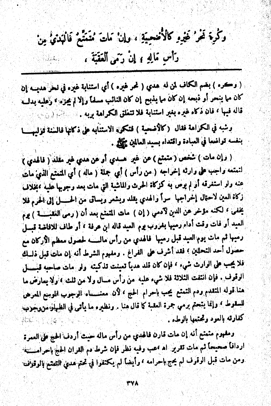 (وَإِنْ مَاتَ) شَخْصٌ (مُتَمَتِّعٌ) عَنْ غَيْرِ هَدْيٍ أَوْ عَنْ هَدْيٍ غَيْرِ مُقَلَّدٍ (فَالْهَدْيُ) لِتَمَتُّعِهِ وَاجِبٌ عَلَى وَارِثِهِ إخْرَاجُهُ (مِنْ رَأْسِ) أَيْ: جُمْلَةِ (مَالِهِ) أَيْ الْمُتَمَتِّعِ الَّذِي مَاتَ عَنْهُ وَلَوْ اسْتَغْرَقَهُ أَوْ لَمْ يُوصِ بِهِ كَزَكَاةِ الْحَرْثِ وَالْمَاشِيَةِ الَّتِي مَاتَ بَعْدَ وُجُوبِهَا عَلَيْهِ، بِخِلَافِ زَكَاةِ الْعَيْنِ لِاحْتِمَالِ إخْرَاجِهَا سِرًّا وَالْهَدْيُ يُقَلَّدُ وَيُشْعَرُ وَيُسَاقُ مِنْ الْحِلِّ إلَى الْحَرَمِ فَلَا يَخْفَى، لَكِنَّهُ مُؤَخَّرٌ عَنْ الدَّيْنِ لِآدَمِيٍّ (إنْ) مَاتَ الْمُتَمَتِّعُ بَعْدَ أَنْ (رَمَى الْعَقَبَةَ) يَوْمَ الْعِيدِ أَوْ فَاتَ وَقْتُ أَدَاءِ رَمْيِهَا بِغُرُوبٍ يَوْمَ الْعِيدِ قَالَهُ ابْنُ عَرَفَةَ، أَوْ طَافَ لِلْإِفَاضَةِ قَبْلَ رَمْيِهَا ثُمَّ مَاتَ يَوْمَ الْعِيدِ قَبْلَ رَمْيِهَا فَالْهَدْيُ مِنْ رَأْسِ مَالِهِ لِحُصُولِ مُعْظَمِ الْأَرْكَانِ مَعَ حُصُولِ أَحَدِ التَّحَلُّلَيْنِ، فَقَدْ أَشْرَفَ عَلَى الْفَرَاغِ. وَمَفْهُومُ الشَّرْطِ أَنَّهُ إنْ مَاتَ قَبْلَ ذَلِكَ فَلَا يَجِبُ عَلَى الْوَارِثِ شَيْءٌ، فَإِنْ كَانَ قَلَّدَ هَدْيًا تَعَيَّنَتْ تَذْكِيَتُهُ وَلَوْ مَاتَ صَاحِبُهُ قَبْلَ الْوُقُوفِ. فَإِنْ انْتَفَتْ الثَّلَاثَةُ فَلَا شَيْءَ عَلَيْهِ مِنْ رَأْسِ مَالٍ وَلَا مِنْ ثُلُثٍ، وَلَا يُعَارِضُ مَا هُنَا قَوْلُهُ الْمُتَقَدِّمُ وَدَمُ التَّمَتُّعِ يَجِبُ بِإِحْرَامِ الْحَجِّ؛ لِأَنَّ مَعْنَاهُ الْوُجُوبُ الْمُوَسَّعُ الْمُعَرِّضُ لِلسُّقُوطِ، وَإِنَّمَا يَتَحَتَّمُ بِرَمْيِ جَمْرَةِ الْعَقَبَةِ كَمَا قَالَ هُنَا. وَنَظِيرُهُ مَا يَأْتِي فِي الظِّهَارِ مِنْ وُجُوبِ كَفَّارَتِهِ بِالْعَوْدِ وَتَحَتُّمِهَا بِالْوَطْءِ.