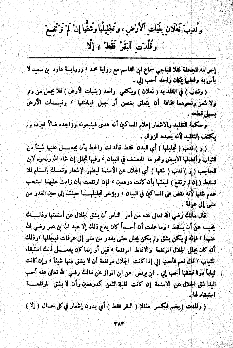 قَالَ مَالِكٌ - رَضِيَ اللَّهُ تَعَالَى عَنْهُ - مَنْ أَمَرَ النَّاسِ أَنْ يُشَقَّ الْجِلَالُ عَنْ أَسْنِمَتِهَا وَذَلِكَ يَحْبِسُهُ عَنْ أَنْ يَسْقُطَ، وَمَا عَلِمْت أَنَّ أَحَدًا كَانَ يَدَعُ ذَلِكَ إلَّا عَبْدَ اللَّهِ بْنَ عُمَرَ - رَضِيَ اللَّهُ عَنْهُمَا -، فَإِنَّهُ لَمْ يَكُنْ يَشُقُّ وَلَمْ يَكُنْ يُجَلِّلُ حَتَّى يَغْدُوَ مِنْ مِنًى إلَى عَرَفَاتٍ فَيُجَلِّلُهَا، وَذَلِكَ أَنَّهُ كَانَ يُجَلِّلُ الْجِلَالَ الْمُرْتَفِعَةَ وَالْأَنْمَاطَ الْمُرْتَفِعَةَ، قَبْلُ أَوْ إنَّمَا كَانَ يَفْعَلُ ذَلِكَ اسْتِبْقَاءً لِلثِّيَابِ، قَالَ: نَعَمْ فَأَحَبُّ إلَيَّ إذَا كَانَتْ الْجِلَالُ مُرْتَفِعَةً أَنْ لَا يَشُقَّ مِنْهَا شَيْئًا، وَإِنْ كَانَتْ ثِيَابًا دُونًا فَشَقُّهَا أَحَبُّ إلَيَّ. ابْنُ يُونُسَ عَنْ ابْنِ الْمَوَّازِ عَنْ مَالِكٍ - رَضِيَ اللَّهُ تَعَالَى عَنْهُ - أَحَبُّ إلَيْنَا شَقُّ الْجِلَالِ عَنْ الْأَسْنِمَةِ إنْ كَانَتْ قَلِيلَةَ الثَّمَنِ كَدِرْهَمَيْنِ وَأَنْ لَا يَشُقَّ الْمُرْتَفِعَةَ اسْتِبْقَاءً لَهَا.
