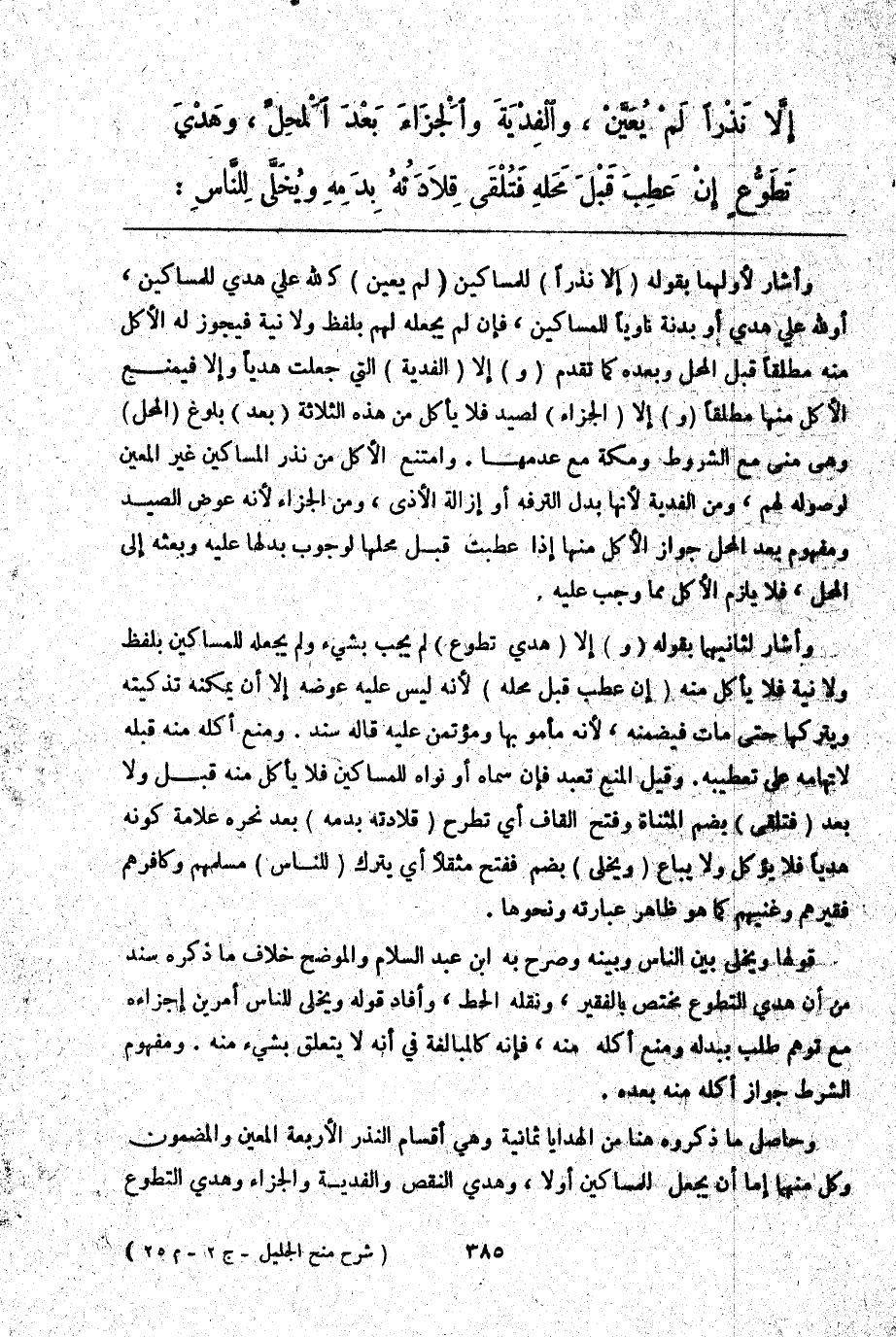 ـــــــــــــــــــــــــــــQوَأَشَارَ لِأَوَّلِهِمَا بِقَوْلِهِ (إلَّا نَذْرًا) لِلْمَسَاكِينِ (لَمْ يُعَيَّنْ) كَ لِلَّهِ عَلَيَّ هَدْيٌ لِلْمَسَاكِينِ، أَوْ لِلَّهِ عَلَيَّ هَدْيٌ أَوْ بَدَنَةٌ نَاوِيًا لِلْمَسَاكِينِ، فَإِنْ لَمْ يَجْعَلْهُ لَهُمْ بِلَفْظٍ وَلَا نِيَّةٍ فَيَجُوزُ لَهُ الْأَكْلُ مِنْهُ مُطْلَقًا قَبْلَ الْمَحَلِّ وَبَعْدَهُ كَمَا تَقَدَّمَ (وَ) إلَّا (الْفِدْيَةَ) الَّتِي جُعِلَتْ هَدْيًا وَإِلَّا فَيُمْنَعُ الْأَكْلَ مِنْهَا مُطْلَقًا (وَ) إلَّا (الْجَزَاءَ) لِصَيْدٍ فَلَا يَأْكُلُ مِنْ هَذِهِ الثَّلَاثَةِ (بَعْدَ) بُلُوغِ (الْمَحَلِّ) وَهِيَ مِنًى مَعَ الشُّرُوطِ وَمَكَّةُ مَعَ عَدَمِهَا. وَامْتَنَعَ الْأَكْلُ مِنْ نَذْرِ الْمَسَاكِينِ غَيْرِ الْمُعَيَّنِ لِوُصُولِهِ لَهُمْ، وَمِنْ الْفِدْيَةِ؛ لِأَنَّهَا بَدَلُ التَّرَفُّهِ أَوْ إزَالَةِ الْأَذَى، وَمِنْ الْجَزَاءِ؛ لِأَنَّهُ عِوَضُ الصَّيْدِ وَمَفْهُومُ بَعْدَ الْمَحَلِّ جَوَازُ الْأَكْلِ مِنْهَا إذَا عَطِبَتْ قَبْلَ مَحَلِّهَا لِوُجُوبِ بَدَلِهَا عَلَيْهِ وَبَعْثِهِ إلَى الْمَحَلِّ، فَلَا يَلْزَمُ الْأَكْلُ مِمَّا وَجَبَ عَلَيْهِ.