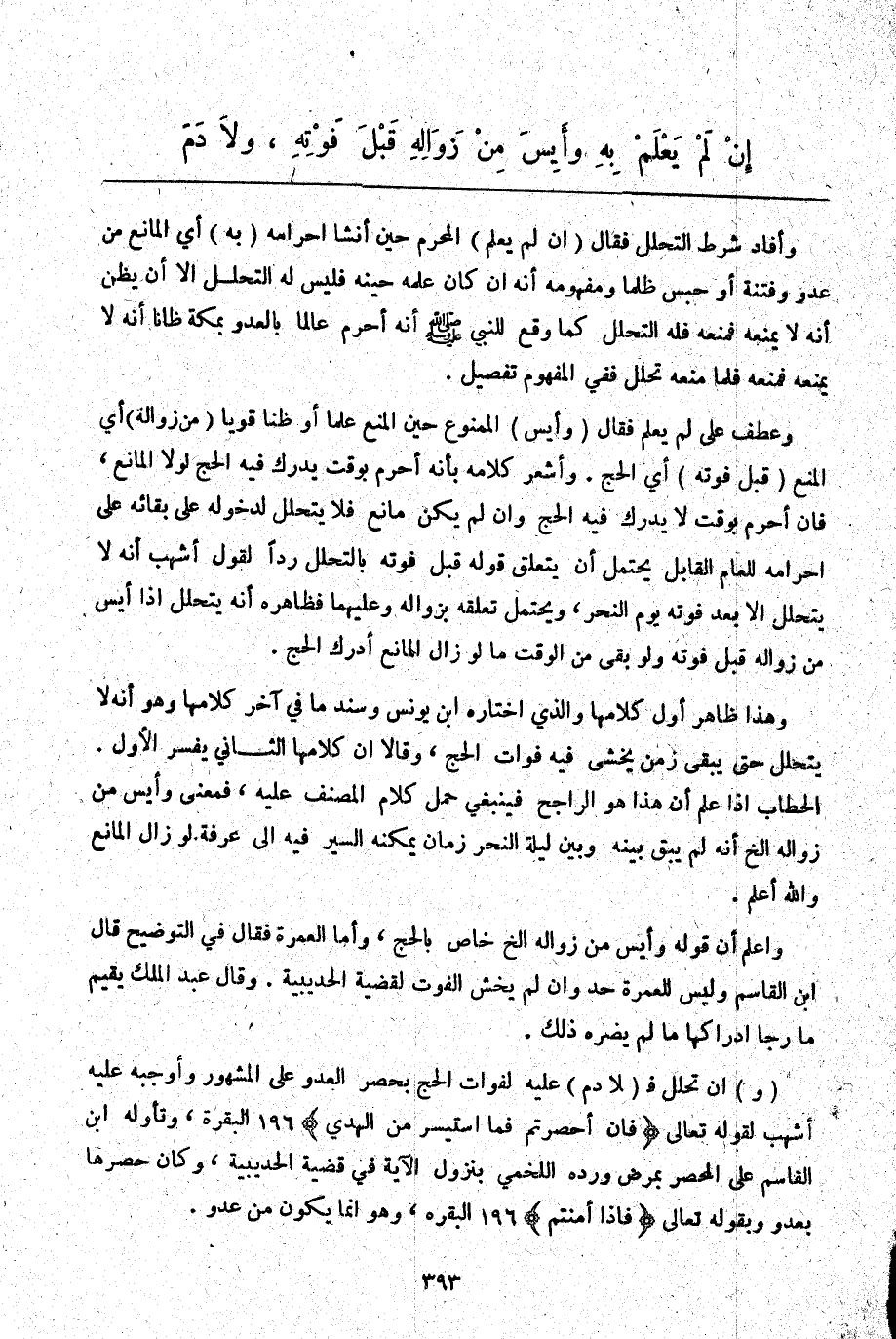 وَهُوَ ظَاهِرُ أَوَّلِ كَلَامِهَا وَاَلَّذِي اخْتَارَهُ ابْنُ يُونُسَ وَسَنَدٌ مَا فِي آخِرِ كَلَامِهَا وَهُوَ أَنَّهُ لَا يَتَحَلَّلُ حَتَّى يَبْقَى زَمَنٌ يَخْشَى فِيهِ فَوَاتَ الْحَجِّ، وَقَالَا إنَّ كَلَامَهَا الثَّانِيَ يُفَسِّرُ الْأَوَّلَ. الْحَطَّابُ إذَا عَلِمَ أَنَّ هَذَا هُوَ الرَّاجِحُ فَيَنْبَغِي حَمْلُ كَلَامِ الْمُصَنِّفِ عَلَيْهِ، فَمَعْنَى وَأَيِسَ مِنْ زَوَالِهِ إلَخْ أَنَّهُ لَمْ يَبْقَ بَيْنَهُ وَبَيْنَ لَيْلَةِ النَّحْرِ زَمَانُ يُمَكِّنُهُ السَّيْرُ فِيهِ إلَى عَرَفَةَ لَوْ زَالَ الْمَانِعُ وَاَللَّهُ أَعْلَمُ.