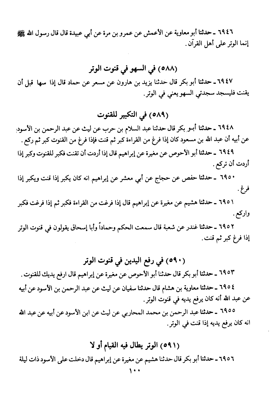 6953 - حَدَّثَنَا أَبُو بَكْرٍ قَالَ: حَدَّثَنَا أَبُو الْأَحْوَصِ، عَنْ مُغِيرَةَ، عَنْ إِبْرَاهِيمَ، قَالَ: «§ارْفَعْ يَدَيْكَ لِلْقُنُوتِ»