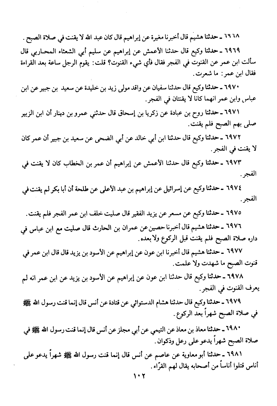 6978 - حَدَّثَنَا وَكِيعٌ، قَالَ: حَدَّثَنَا ابْنُ عَوْنٍ، عَنْ إِبْرَاهِيمَ، عَنِ الْأَسْوَدِ بْنِ يَزِيدَ، عَنِ ابْنِ عُمَرَ، «أَنَّهُ §لَمْ يَعْرِفْ الْقُنُوتَ فِي الْفَجْرِ»