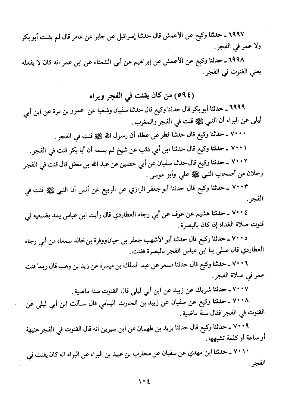 7008 - حَدَّثَنَا وَكِيعٌ، عَنْ سُفْيَانَ، عَنْ زُبَيْدِ بْنِ الْحَارِثِ الْيَامِيِّ، قَالَ: سَأَلْتُ ابْنَ أَبِي لَيْلَى، عَنْ §الْقُنُوتِ فِي الْفَجْرِ؟ فَقَالَ: «سُنَّةٌ مَاضِيَةٌ»