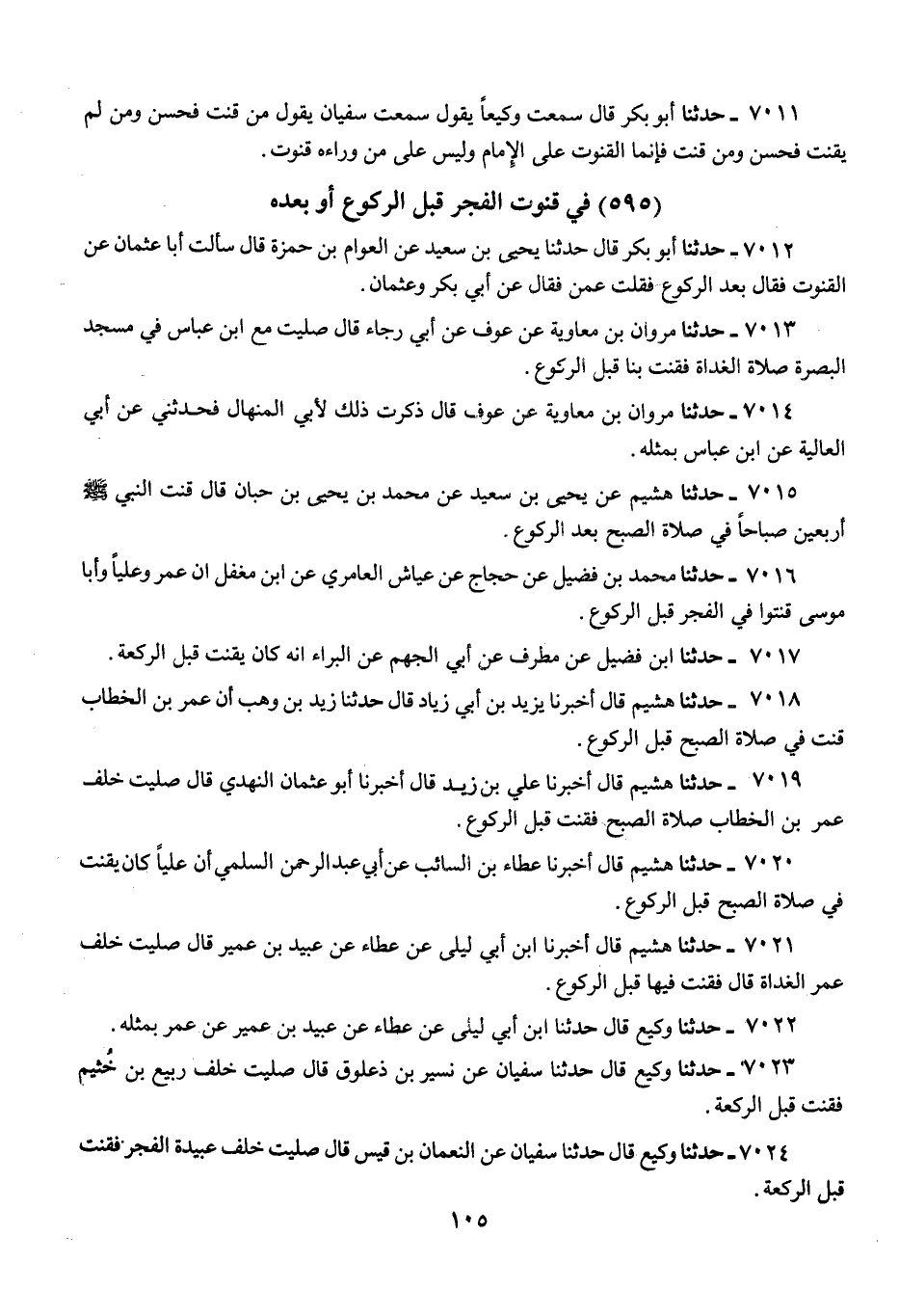 7018 - حَدَّثَنَا هُشَيْمٌ، قَالَ: أَخْبَرَنَا يَزِيدُ بْنُ أَبِي زِيَادٍ، قَالَ: حَدَّثَنَا زَيْدُ بْنُ وَهْبٍ، «أَنَّ عُمَرَ بْنَ الْخَطَّابِ §قَنَتَ فِي صَلَاةِ الصُّبْحِ قَبْلَ الرُّكُوعِ»