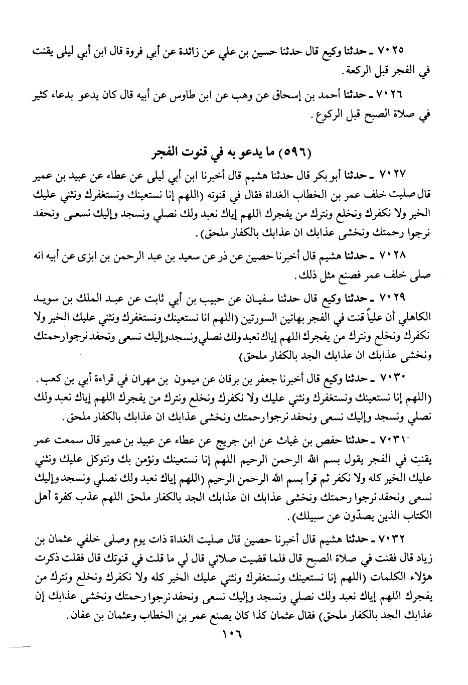 7029 - حَدَّثَنَا وَكِيعٌ، قَالَ: حَدَّثَنَا سُفْيَانُ، عَنْ حَبِيبِ بْنِ أَبِي ثَابِتٍ، عَنْ عَبْدِ الْمَلِكِ بْنِ سُوَيْدٍ الْكَاهِلِيِّ، أَنَّ عَلِيًّا قَنَتَ فِي الْفَجْرِ بِهَاتَيْنِ السُّورَتَيْنِ: «§اللَّهُمَّ إِنَّا نَسْتَعِينُكَ وَنَسْتَغْفِرُكَ وَنُثْنِي عَلَيْكَ الْخَيْرَ، وَلَا نَكْفُرُ، وَنَخْلَعُ وَنَتْرُكُ مَنْ يَفْجُرُكَ، اللَّهُمَّ إِيَّاكَ نَعْبُدُ وَلَكَ نُصَلِّي وَنَسْجُدُ، وَإِلَيْكَ نَسْعَى وَنَحْفِدُ نَرْجُو رَحْمَتَكَ، وَنَخْشَى عَذَابَكَ، إِنَّ عَذَابَكَ الْجِدَّ بِالْكُفَّارِ مُلْحِقٌ»