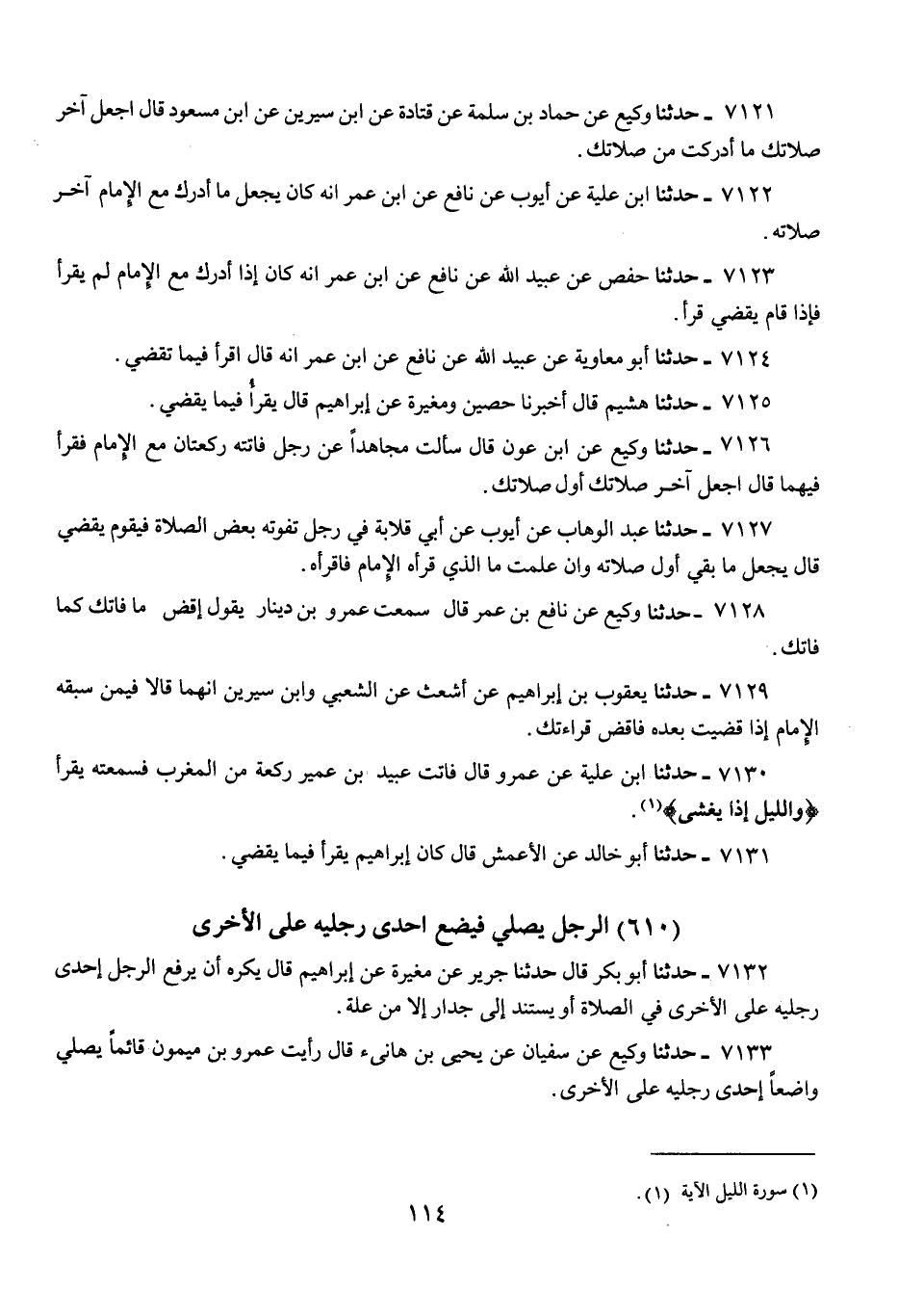 7133 - حَدَّثَنَا وَكِيعٌ، عَنْ سُفْيَانَ، عَنْ يَحْيَى بْنِ هَانِئٍ، قَالَ: «رَأَيْتُ عَمْرَو بْنَ مَيْمُونٍ قَائِمًا §يُصَلِّي وَاضِعًا إِحْدَى رِجْلَيْهِ عَلَى الْأُخْرَى»