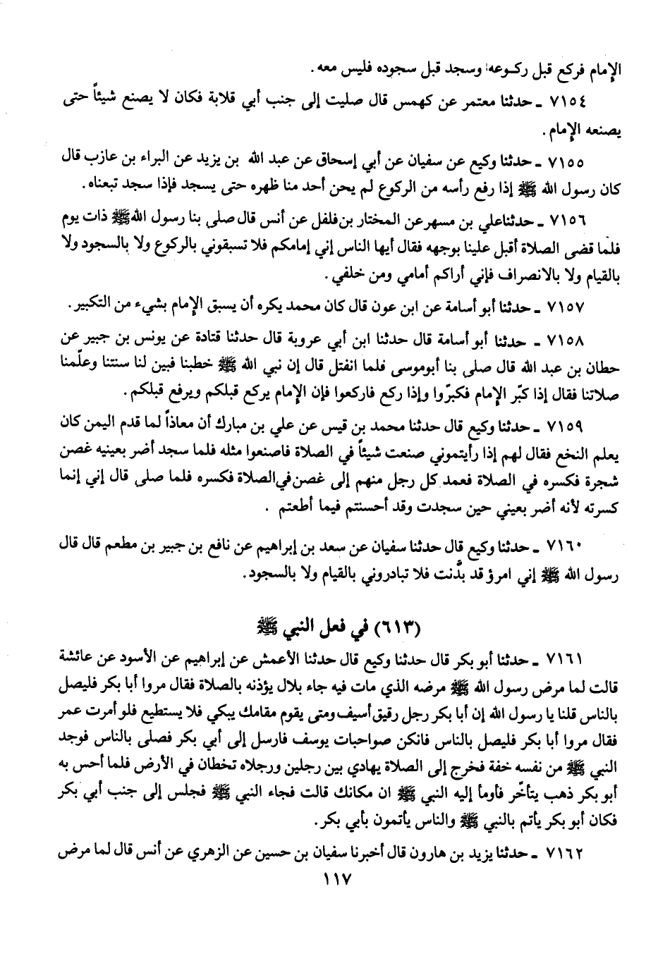 7155 - حَدَّثَنَا وَكِيعٌ، عَنْ سُفْيَانَ، عَنْ أَبِي إِسْحَاقَ، عَنْ عَبْدِ اللَّهِ بْنِ يَزِيدَ، عَنِ الْبَرَاءِ بْنِ عَازِبٍ، قَالَ: «كَانَ رَسُولُ اللَّهِ صَلَّى اللهُ عَلَيْهِ وَسَلَّمَ §إِذَا رَفَعَ رَأْسَهُ مِنَ الرُّكُوعِ لَمْ يَحْنِ أَحَدٌ مِنَّا ظَهْرَهُ حَتَّى يَسْجُدَ، فَإِذَا سَجَدَ تَبِعْنَاهُ»