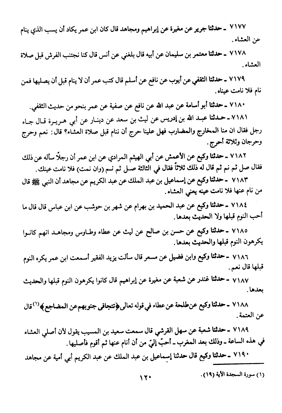 7188 - حَدَّثَنَا وَكِيعٌ، عَنْ طَلْحَةَ، عَنْ عَطَاءٍ، فِي قَوْلِهِ تَعَالَى: {§تَتَجَافَى جُنُوبُهُمْ عَنِ الْمَضَاجِعِ} [السجدة: 16] قَالَ: «فِي الْعَتَمَةِ»