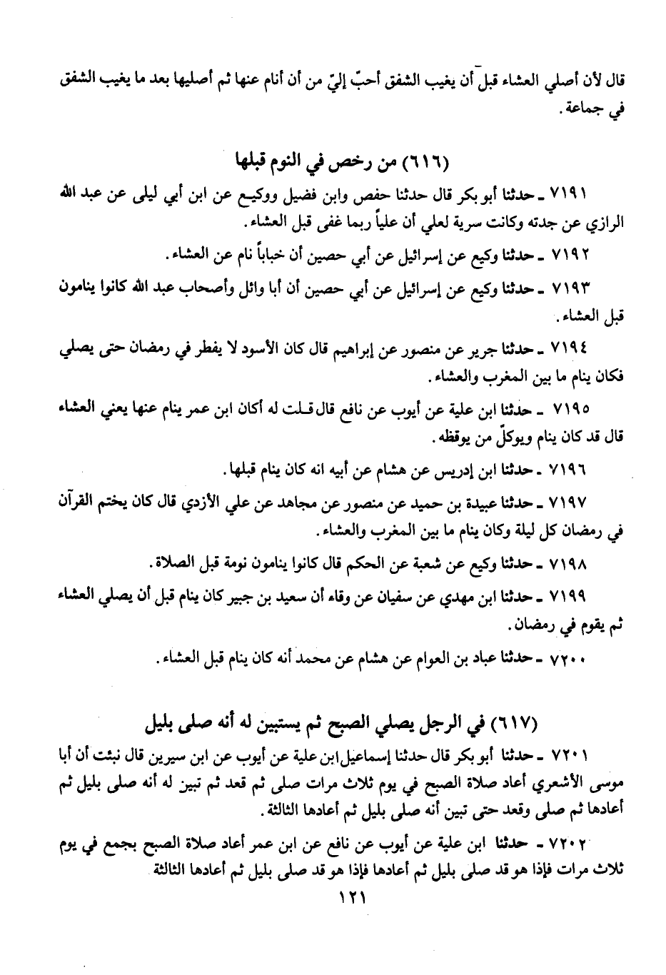 7193 - حَدَّثَنَا وَكِيعٌ، عَنْ إِسْرَائِيلَ، عَنْ أَبِي حُصَيْنٍ، «أَنَّ أَبَا وَائِلٍ، وَأَصْحَابَ عَبْدِ اللَّهِ كَانُوا §يَنَامُونَ قَبْلَ الْعِشَاءِ»