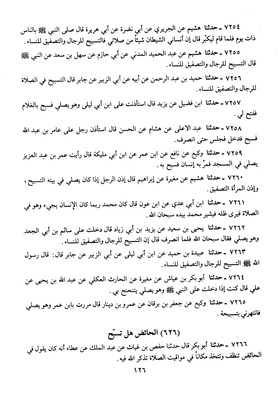 7262 - حَدَّثَنَا يَحْيَى بْنُ سَعِيدٍ، عَنْ يَزِيدَ بْنِ أَبِي زِيَادٍ قَالَ: دَخَلْتُ عَلَى سَالِمِ بْنِ أَبِي الْجَعْدِ وَهُوَ يُصَلِّي، فَقَالَ: «سُبْحَانَ اللَّهِ»، فَلَمَّا انْصَرَفَ، قَالَ: «إِنَّ §التَّسْبِيحَ لِلرِّجَالِ وَالتَّصْفِيقَ لِلنِّسَاءِ»