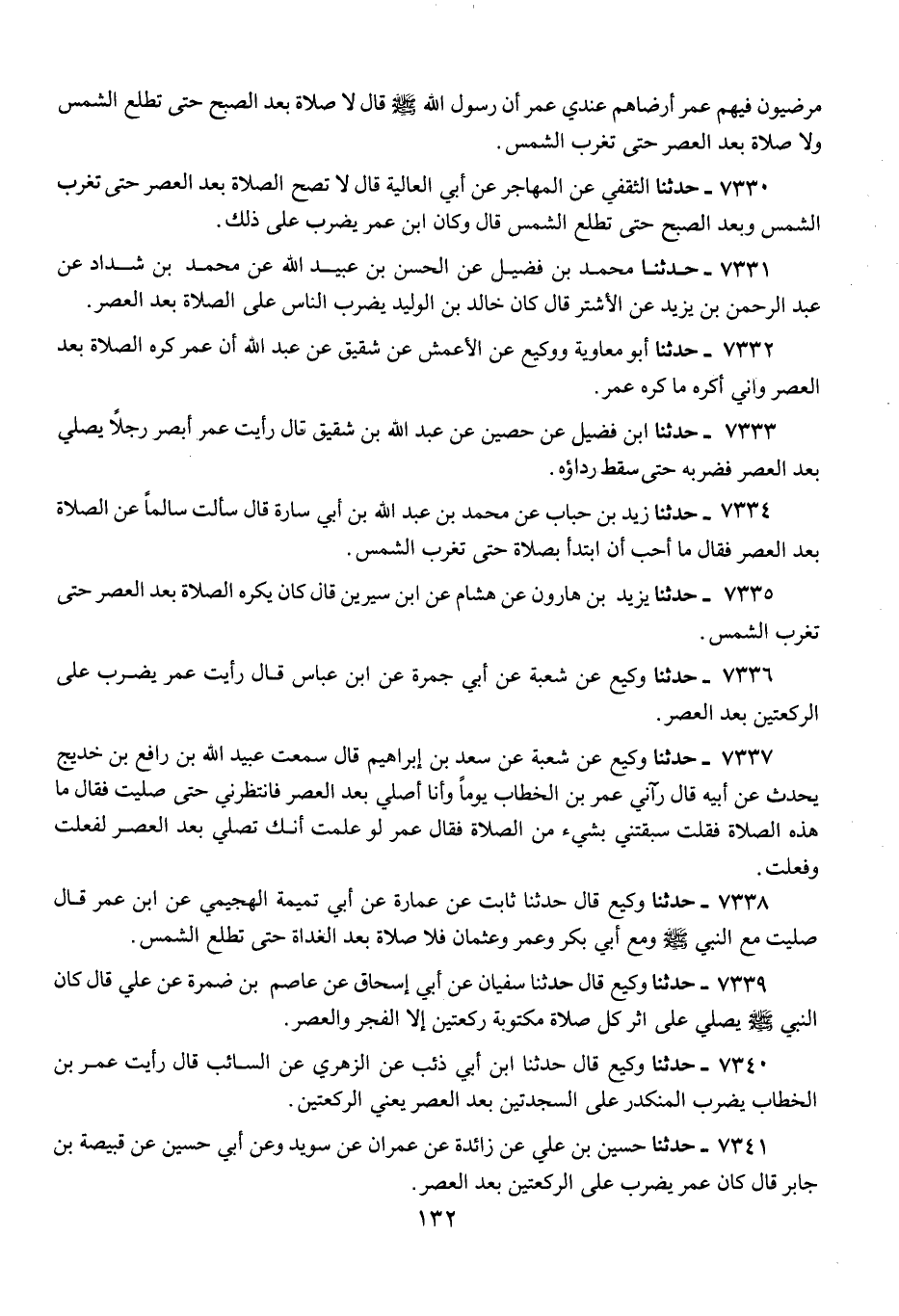 7333 - حَدَّثَنَا ابْنُ فُضَيْلٍ، عَنْ حُصَيْنٍ، عَنْ عَبْدِ اللَّهِ بْنِ شَقِيقٍ، قَالَ: «رَأَيْتُ عُمَرَ §أَبْصَرَ رَجُلًا يُصَلِّي بَعْدَ الْعَصْرِ، فَضَرَبَهُ حَتَّى سَقَطَ رِدَاؤُهُ»