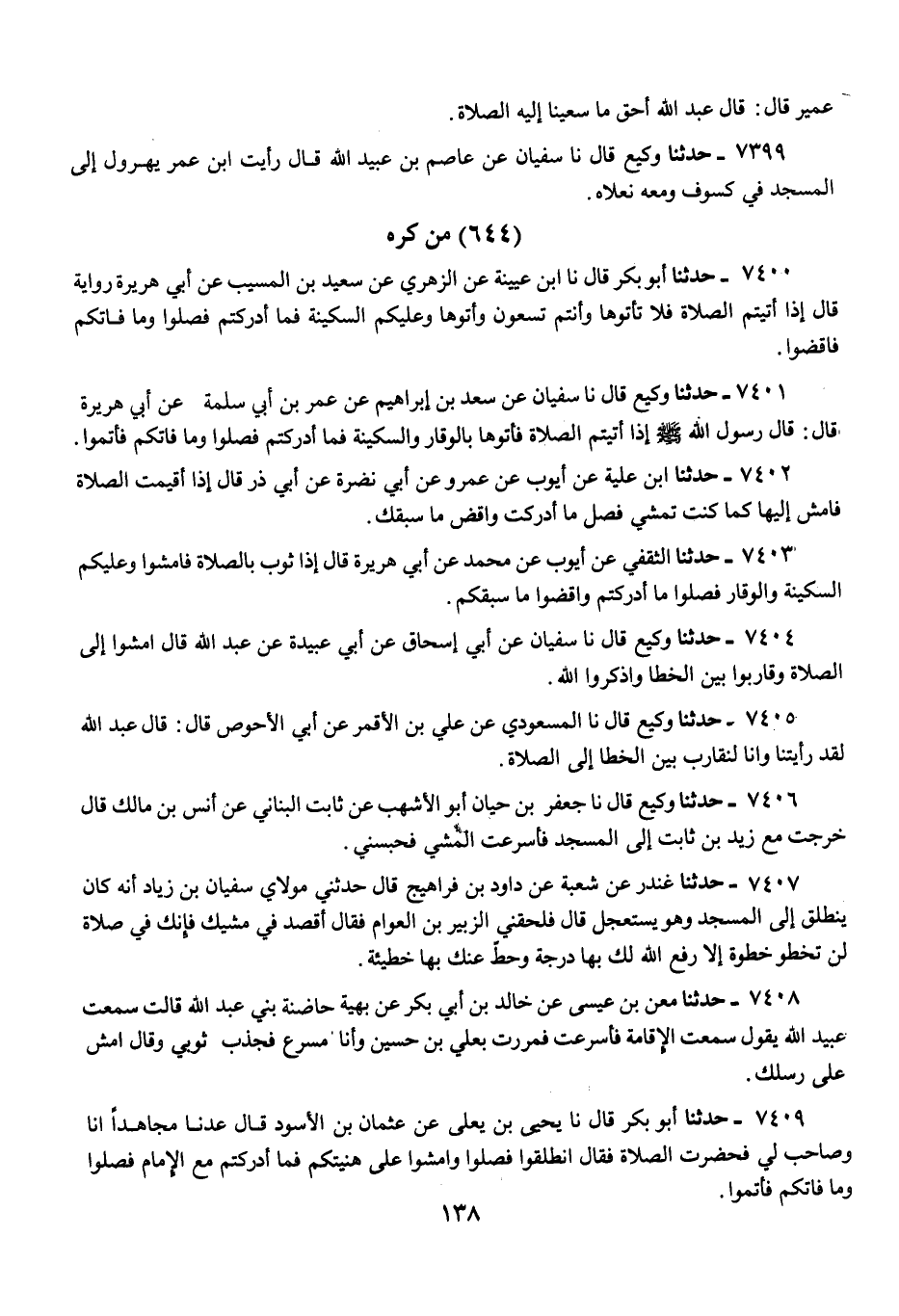7404 - حَدَّثَنَا وَكِيعٌ، قَالَ: نا سُفْيَانُ، عَنْ أَبِي إِسْحَاقَ، عَنْ أَبِي عُبَيْدَةَ، عَنْ عَبْدِ اللَّهِ قَالَ: «§امْشُوا إِلَى الصَّلَاةِ، وَقَارِبُوا بَيْنَ الْخُطَا، وَاذْكُرُوا اللَّهَ»