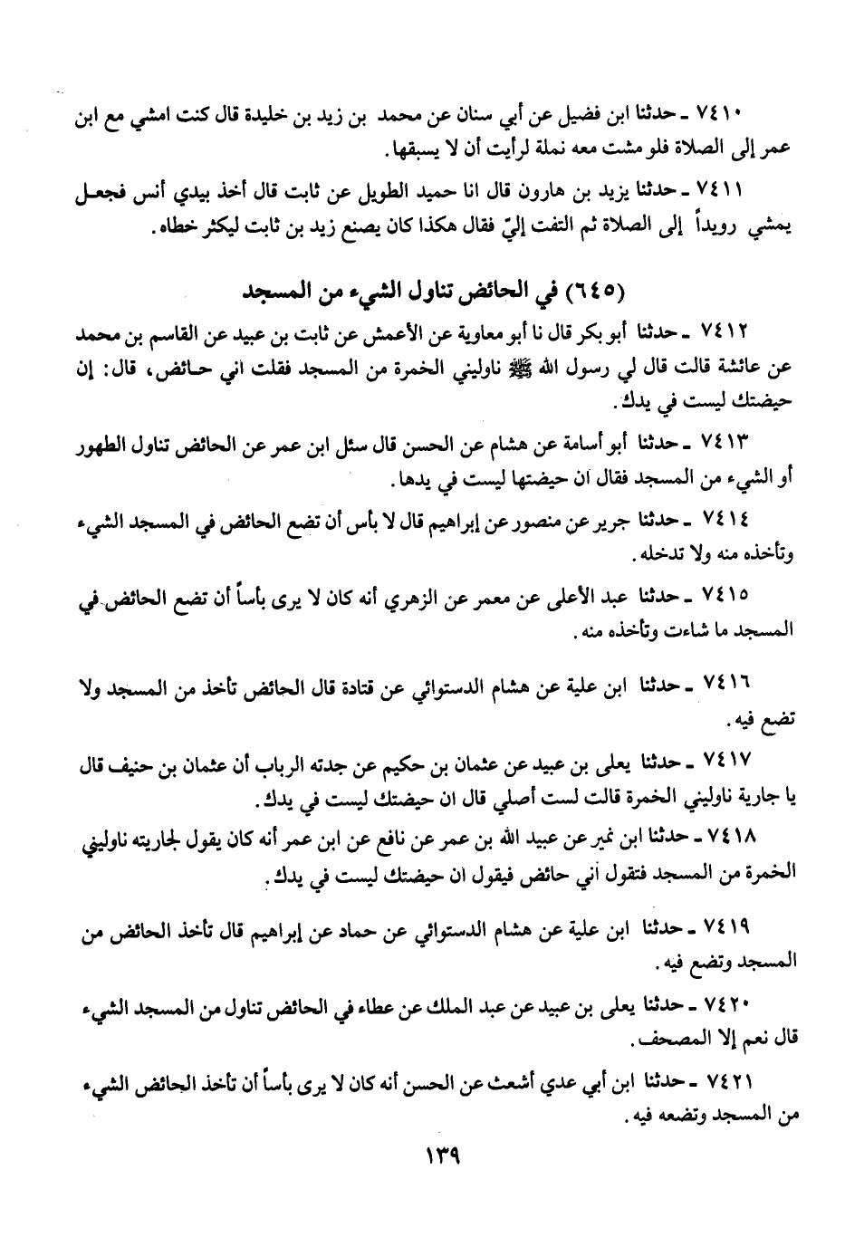 7419 - حَدَّثَنَا ابْنُ عُلَيَّةَ، عَنْ هِشَامٍ الدَّسْتُوَائِيِّ، عَنْ حَمَّادٍ، عَنْ إِبْرَاهِيمَ، قَالَ: «§تَأْخُذُ الْحَائِضُ مِنَ الْمَسْجِدِ وَتَضَعُ فِيهِ»