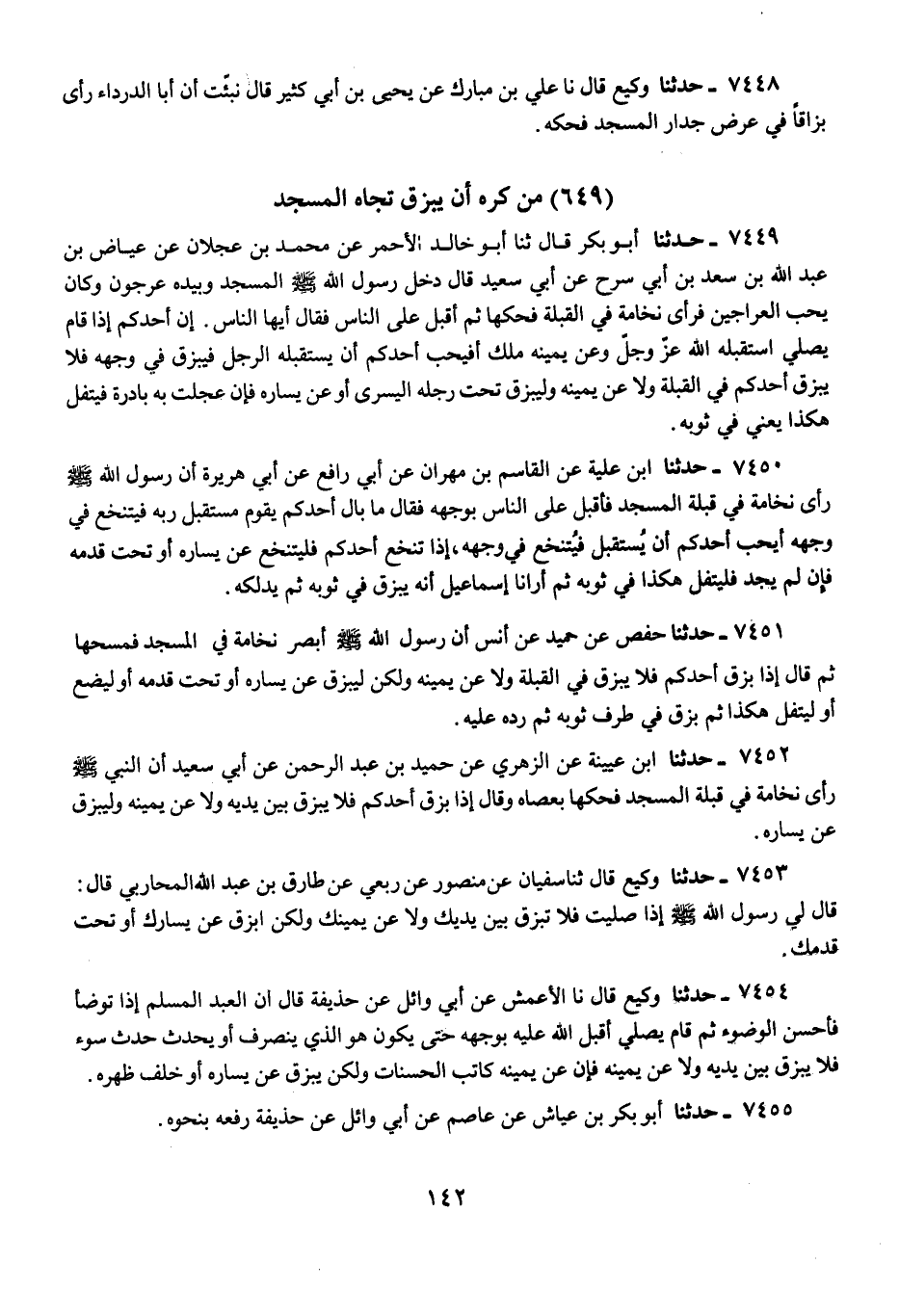 7448 - حَدَّثَنَا وَكِيعٌ، قَالَ: نا عَلِيُّ بْنُ مُبَارَكٍ، عَنْ يَحْيَى بْنِ أَبِي كَثِيرٍ، قَالَ: نُبِّئْتُ «أَنَّ أَبَا الدَّرْدَاءِ §رَأَى بُزَاقًا فِي عُرْضِ جِدَارِ الْمَسْجِدِ فَحَكَّهُ»