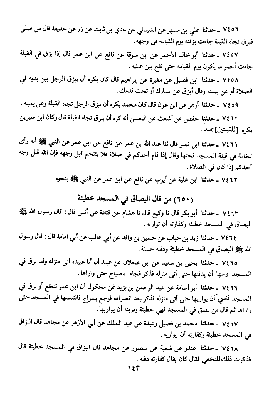 7456 - حَدَّثَنَا عَلِيُّ بْنُ مُسْهِرٍ، عَنِ الشَّيْبَانِيِّ، عَنْ عَدِيِّ بْنِ ثَابِتٍ، عَنْ زِرٍّ، عَنْ حُذَيْفَةَ، قَالَ: «§مَنْ صَلَّى فَبَزَقَ تُجَاهَ الْقِبْلَةِ جَاءَتْ بَزْقَتُهُ يَوْمَ الْقِيَامَةِ فِي وَجْهِهِ»