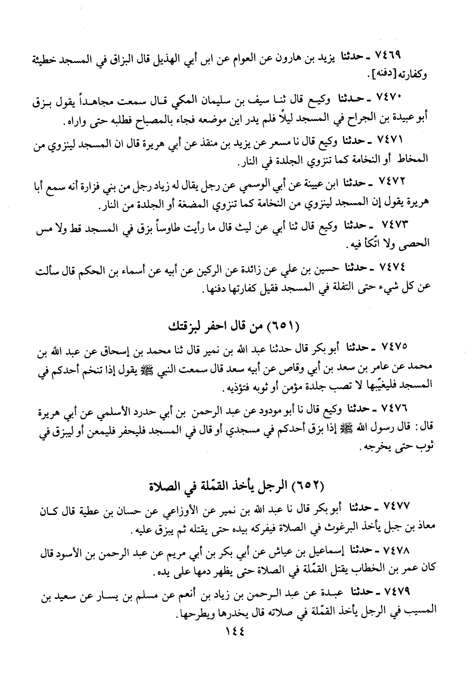 7471 - حَدَّثَنَا وَكِيعٌ، قَالَ: نا مِسْعَرٌ، عَنْ يَزِيدَ بْنِ مُنْقِذٍ، عَنْ أَبِي هُرَيْرَةَ، قَالَ: «إِنَّ §الْمَسْجِدَ لَيَنْزَوِي مِنَ الْمُخَاطِ، أَوِ النُّخَامَةِ، كَمَا تَنْزَوِي الْجِلْدَةُ فِي النَّارِ»