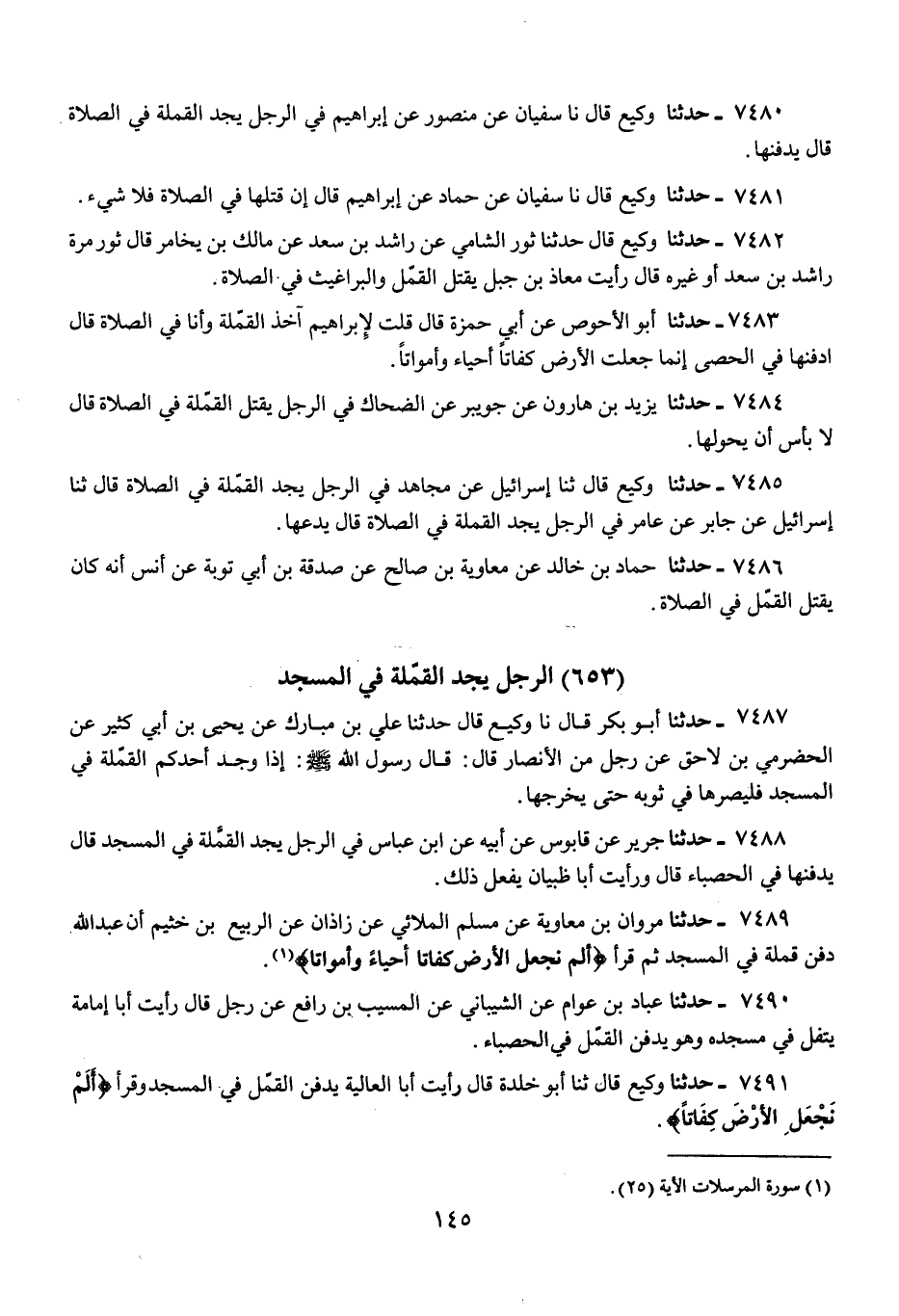 7480 - حَدَّثَنَا وَكِيعٌ، قَالَ: نا سُفْيَانُ، عَنْ مَنْصُورٍ، عَنْ إِبْرَاهِيمَ، فِي الرَّجُلِ يَجِدُ الْقَمْلَةَ فِي الصَّلَاةِ قَالَ: «§يَدْفِنُهَا»
