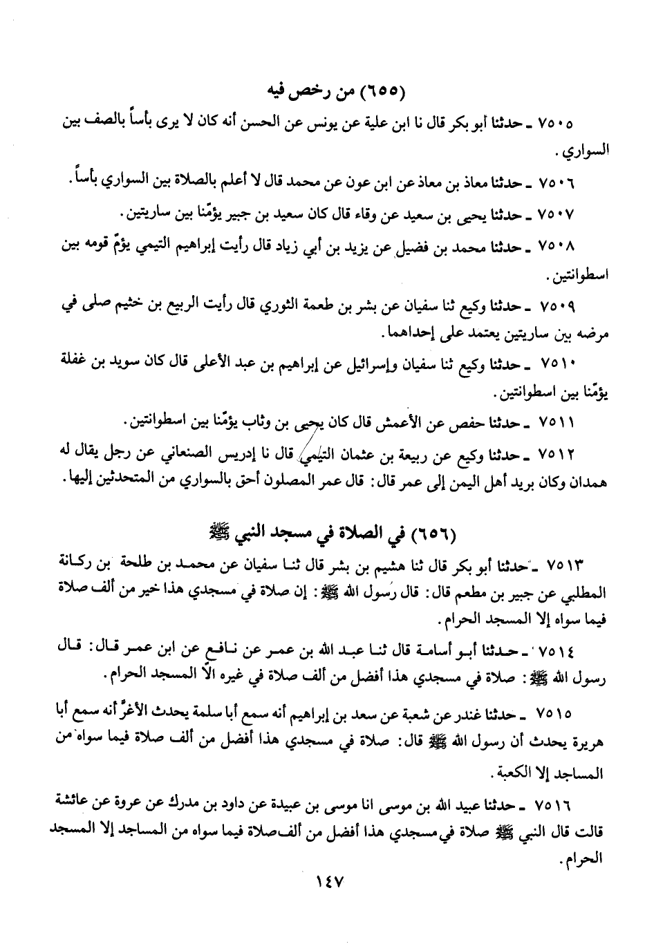 7505 - حَدَّثَنَا أَبُو بَكْرٍ قَالَ: نا ابْنُ عُلَيَّةَ، عَنْ يُونُسَ، عَنِ الْحَسَنِ: «أَنَّهُ كَانَ §لَا يَرَى بَأْسًا بِالصَّفِّ بَيْنَ السَّوَارِي»