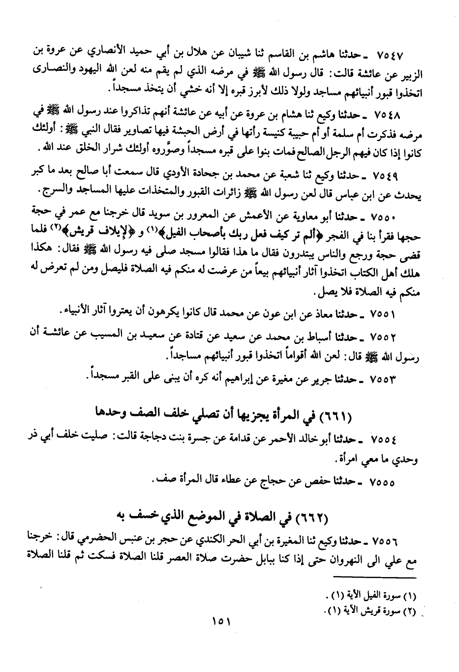 7550 - حَدَّثَنَا أَبُو مُعَاوِيَةَ، عَنِ الْأَعْمَشِ، عَنِ الْمَعْرُورِ بْنِ سُوَيْدٍ قَالَ: خَرَجْنَا مَعَ عُمَرَ فِي حَجَّةٍ حَجَّهَا، فَقَرَأَ بِنَا فِي الْفَجْرِ: أَلَمْ تَرَ كَيْفَ فَعَلَ رَبُّكَ بِأَصْحَابِ الْفِيلِ، وَلِإِيلَافِ قُرَيْشٍ، فَلَمَّا قَضَى حَجَّهُ وَرَجَعَ وَالنَّاسُ يَبْتَدِرُونَ فَقَالَ: «مَا هَذَا؟» فَقَالُوا: مَسْجِدٌ صَلَّى فِيهِ رَسُولُ اللَّهِ صَلَّى اللهُ عَلَيْهِ وَسَلَّمَ، فَقَالَ: «هَكَذَا §هَلَكَ أَهْلُ الْكِتَابِ، اتَّخَذُوا آثَارَ أَنْبِيَائِهِمْ بِيَعًا، مَنْ عَرَضَتْ لَهُ مِنْكُمْ فِيهِ الصَّلَاةُ فَلْيُصَلِّ، وَمَنْ لَمْ تَعْرِضْ لَهُ مِنْكُمْ فِيهِ الصَّلَاةُ فَلَا يُصَلِّ»