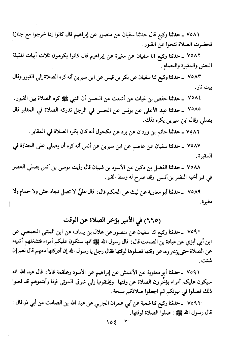 7581 - حَدَّثَنَا وَكِيعٌ، قَالَ: حَدَّثَنَا سُفْيَانُ، عَنْ مَنْصُورٍ، عَنْ إِبْرَاهِيمَ، قَالَ: «كَانُوا §إِذَا خَرَجُوا مَعَ جِنَازَةٍ فَحَضَرَتِ الصَّلَاةُ تَنَحَّوْا عَنِ الْقُبُورِ»