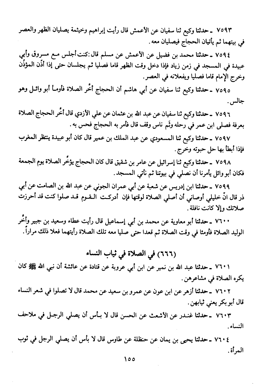 7601 - حَدَّثَنَا عَبْدُ اللَّهِ بْنُ نُمَيْرٍ، عَنِ ابْنِ أَبِي عَرُوبَةَ، عَنْ قَتَادَةَ، عَنْ عَائِشَةَ: «أَنَّ نَبِيَّ اللَّهِ صَلَّى اللهُ عَلَيْهِ وَسَلَّمَ كَانَ §يَكْرَهُ الصَّلَاةَ فِي مَشَاعِرِهِنَّ»