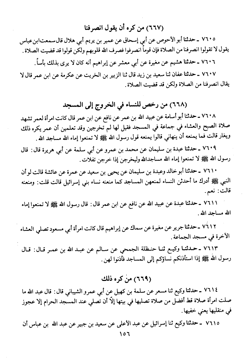 7611 - حَدَّثَنَا عَبْدَةُ، عَنْ عُبَيْدِ اللَّهِ، عَنْ نَافِعٍ، عَنِ ابْنِ عُمَرَ، قَالَ: قَالَ رَسُولُ اللَّهِ صَلَّى اللهُ عَلَيْهِ وَسَلَّمَ: «§لَا تَمْنَعُوا إِمَاءَ اللَّهِ مَسَاجِدَ اللَّهِ»
