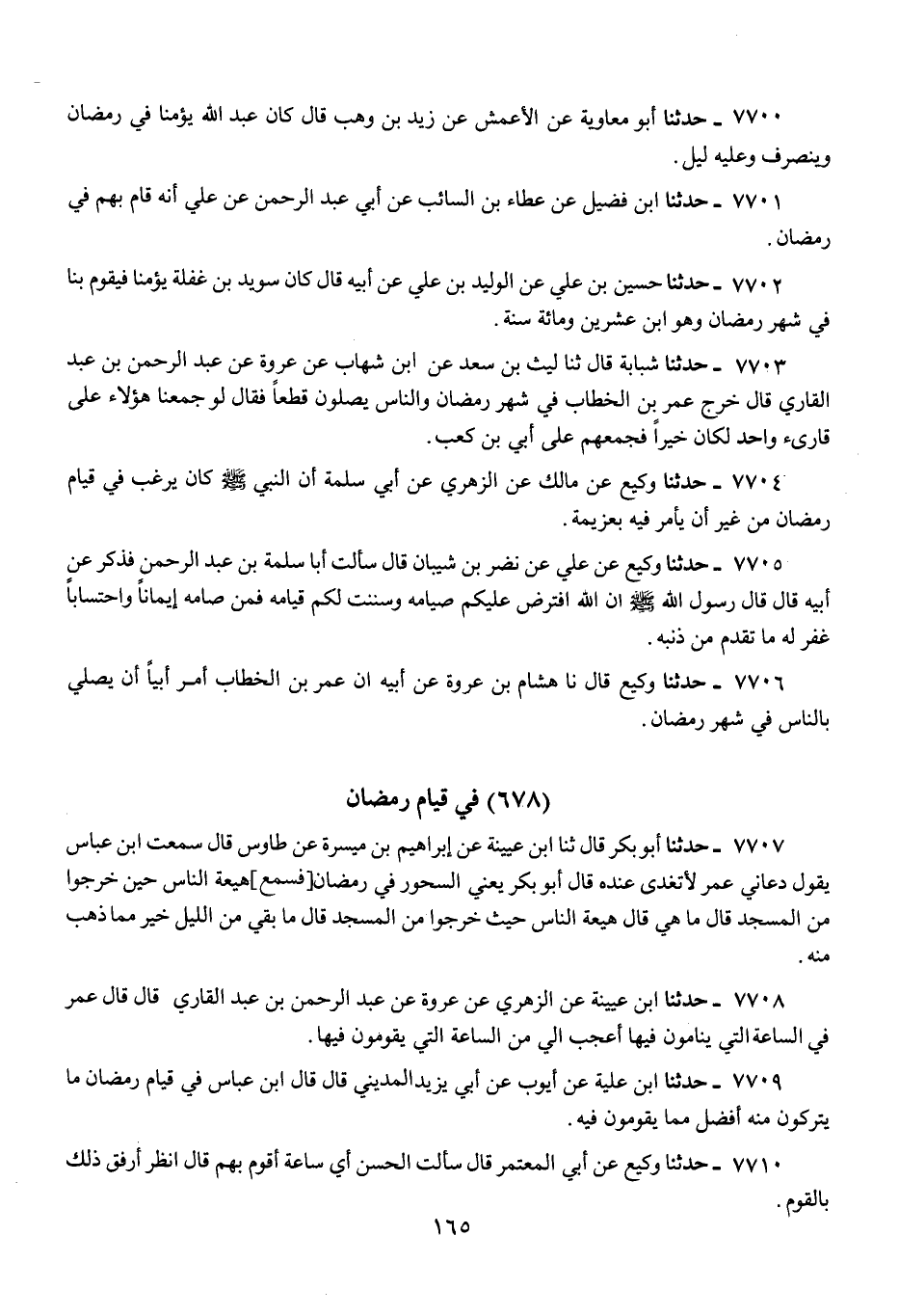 7706 - حَدَّثَنَا وَكِيعٌ، قَالَ: نا هِشَامُ بْنُ عُرْوَةَ، عَنْ أَبِيهِ: «أَنَّ عُمَرَ بْنَ الْخَطَّابِ §أَمَرَ أُبَيًّا أَنْ يُصَلِّيَ بِالنَّاسِ فِي شَهْرِ رَمَضَانَ»