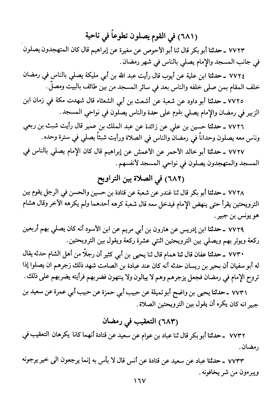 7723 - حَدَّثَنَا أَبُو بَكْرٍ قَالَ: ثنا أَبُو الْأَحْوَصِ، عَنْ مُغِيرَةَ، عَنْ إِبْرَاهِيمَ، قَالَ: «كَانَ §الْمُتَهَجِّدُونَ يُصَلُّونَ فِي جَانِبِ الْمَسْجِدِ، وَالْإِمَامُ يُصَلِّي بِالنَّاسِ فِي شَهْرِ رَمَضَانَ»