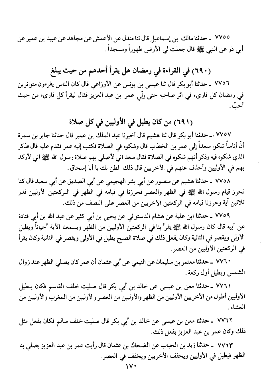 7761 - حَدَّثَنَا مَعْنُ بْنُ عِيسَى، عَنْ خَالِدِ بْنِ أَبِي بَكْرٍ، قَالَ: «صَلَّيْتُ خَلْفَ الْقَاسِمِ فَكَانَ §يُطِيلُ الْأُولَيَيْنِ أَطْوَلَ مِنَ الْأُخْرَيَيْنِ، الْأُولَيَيْنِ مِنَ الظُّهْرِ، وَالْأُولَيَيْنِ مِنَ الْعَصْرِ، وَالْأُولَيَيْنِ مِنَ الْمَغْرِبِ، وَالْأُولَيَيْنِ مِنَ الْعِشَاءِ»